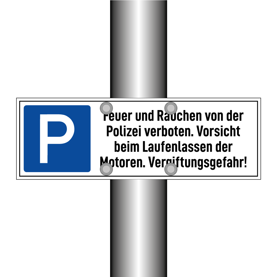 Parkschild mit dem Text Feuer und Rauchen von der Polizei verboten. Vorsicht beim Laufenlassen der Motoren. Vergiftungsgefahr!