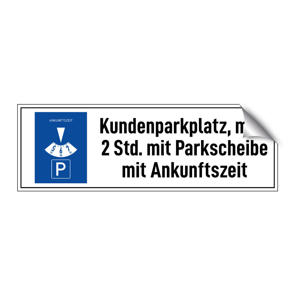 Parkschild mit dem Text Kundenparkplatz, max. 2 Std. mit Parkscheibe mit Ankunftszeit