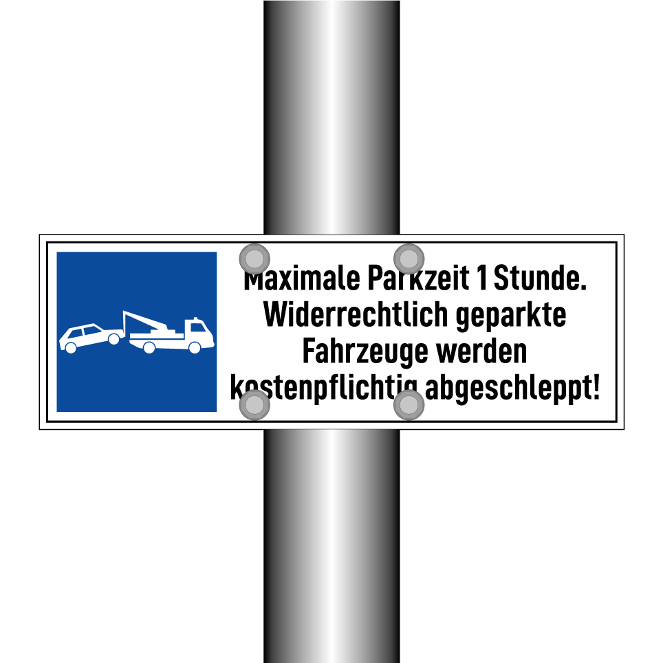 Parkschild mit dem Text Maximale Parkzeit 1 Stunde. Widerrechtlich geparkte Fahrzeuge werden kostenpflichtig abgeschleppt!