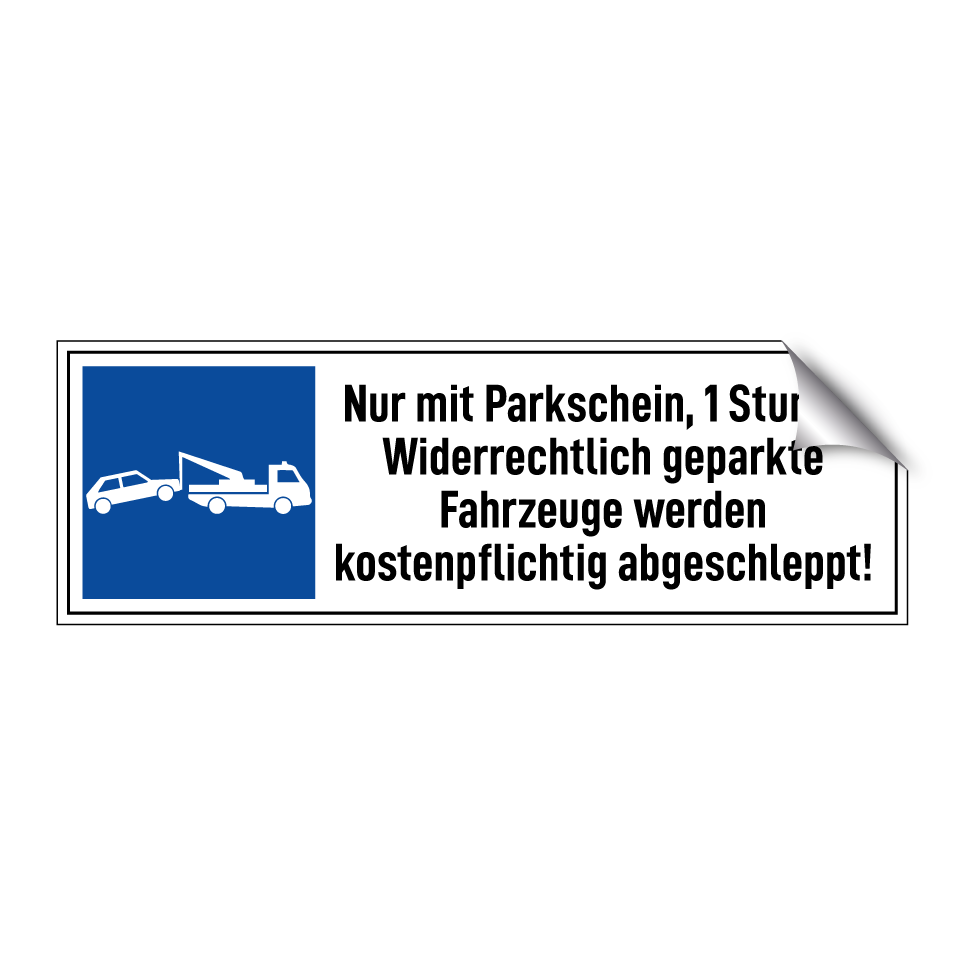 Parkschild mit dem Text Nur mit Parkschein, 1 Stunde. Widerrechtlich geparkte Fahrzeuge werden kostenpflichtig abgeschleppt!