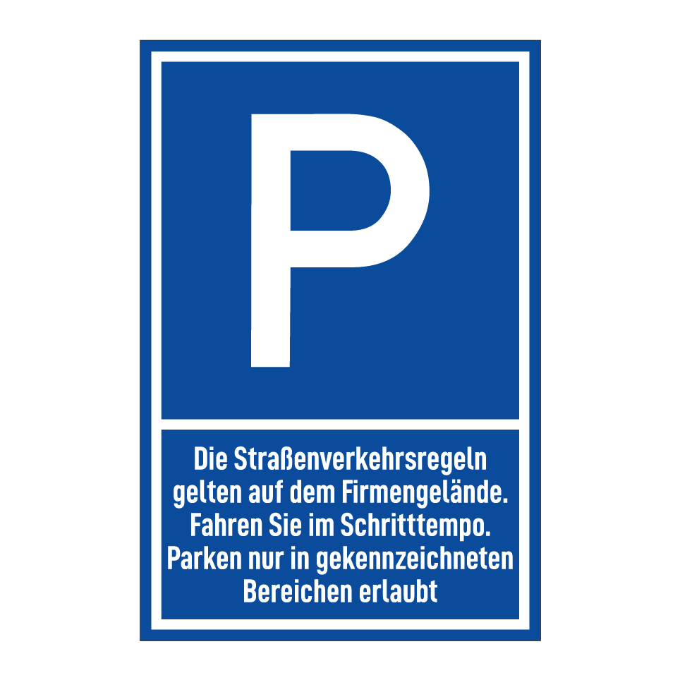 Parkschild mit dem Text Die Straßenverkehrsregeln gelten auf dem Firmengelände. Fahren Sie im Schritttempo. Parken nur in gekennzeichneten Bereichen erlaubt