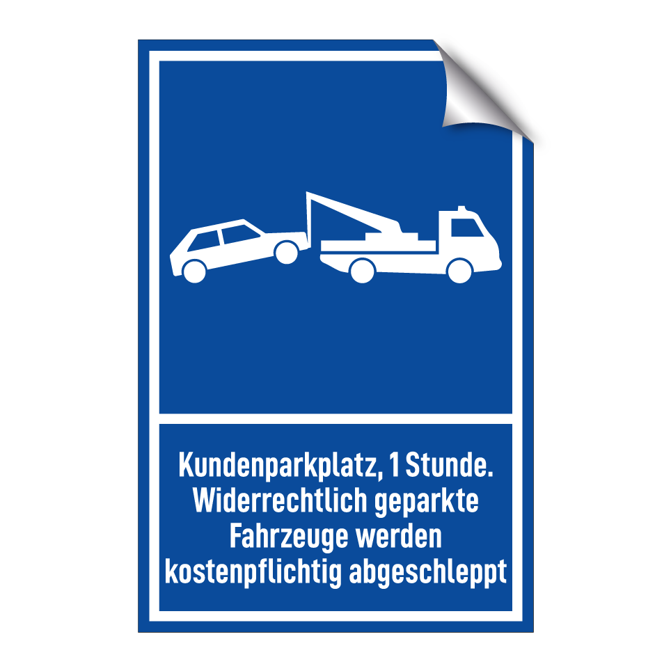 Parkschild mit dem Text Kundenparkplatz, 1 Stunde. Widerrechtlich geparkte Fahrzeuge werden kostenpflichtig abgeschleppt