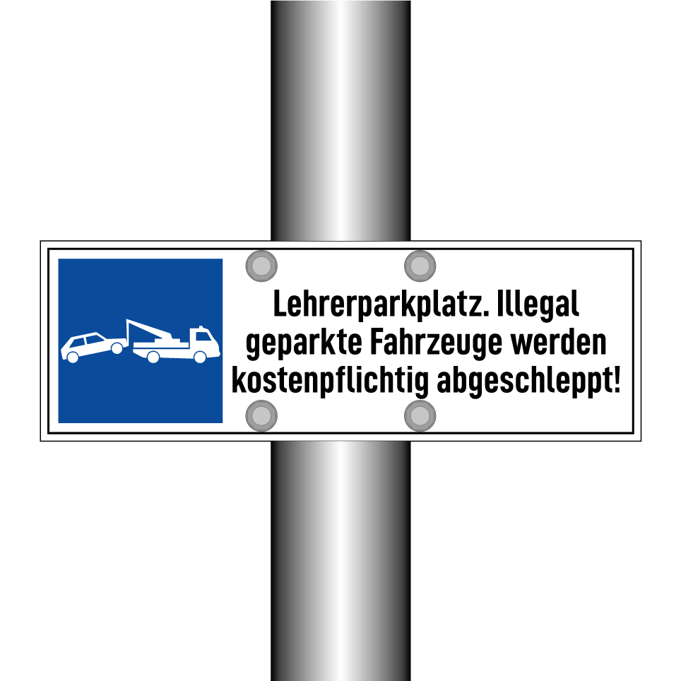 Parkschild mit dem Text Lehrerparkplatz. Illegal geparkte Fahrzeuge werden kostenpflichtig abgeschleppt!