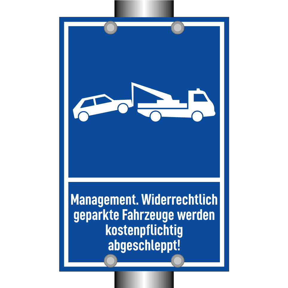 Parkschild mit dem Text Management. Widerrechtlich geparkte Fahrzeuge werden kostenpflichtig abgeschleppt!