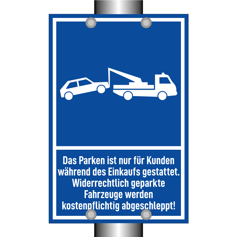 Parkschild mit dem Text Das Parken ist nur für Kunden während des Einkaufs gestattet. Widerrechtlich geparkte Fahrzeuge werden kostenpflichtig abgeschleppt!
