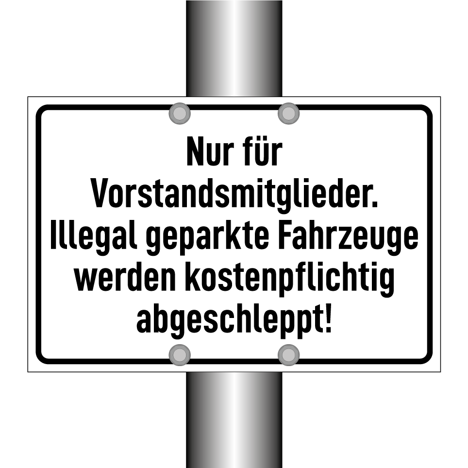 Parkschild mit dem Text Nur für Vorstandsmitglieder. Illegal geparkte Fahrzeuge werden kostenpflichtig abgeschleppt!