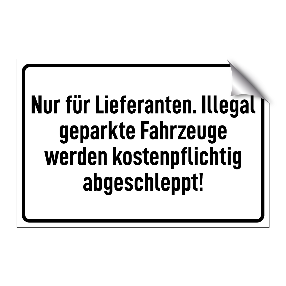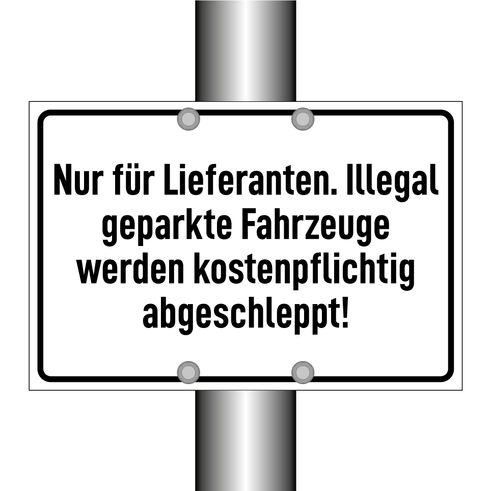 Parkschild mit dem Text Nur für Lieferanten. Illegal geparkte Fahrzeuge werden kostenpflichtig abgeschleppt!