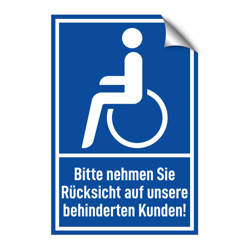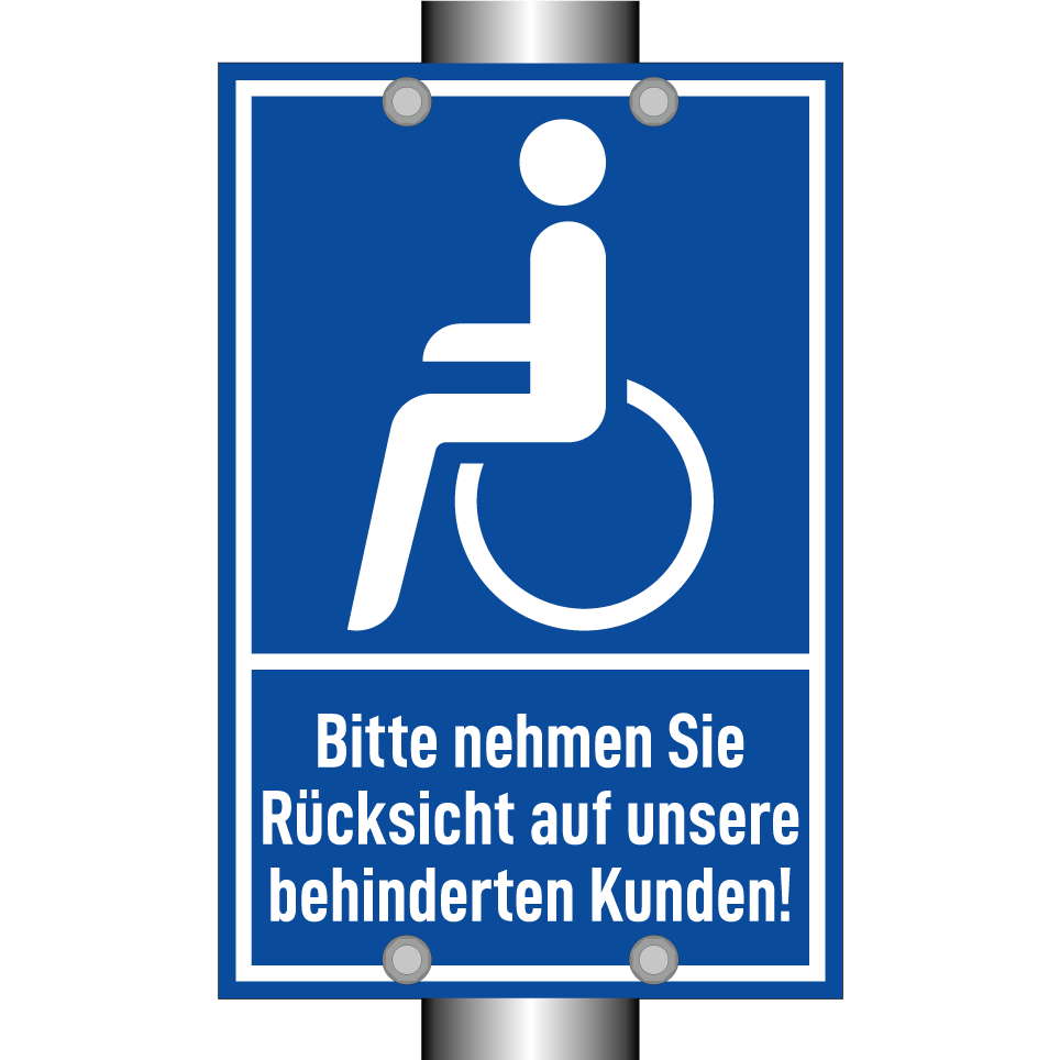 Parkschild mit dem Text Bitte nehmen Sie Rücksicht auf unsere behinderten Kunden!