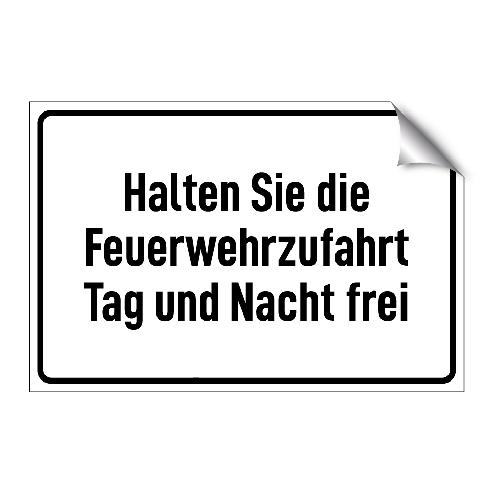 Parkverbotsschild mit dem Text Halten Sie die Feuerwehrzufahrt Tag und Nacht frei