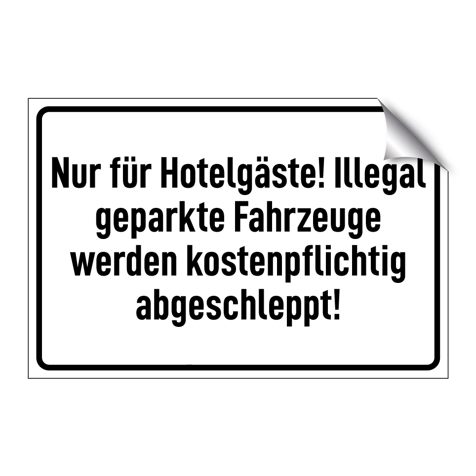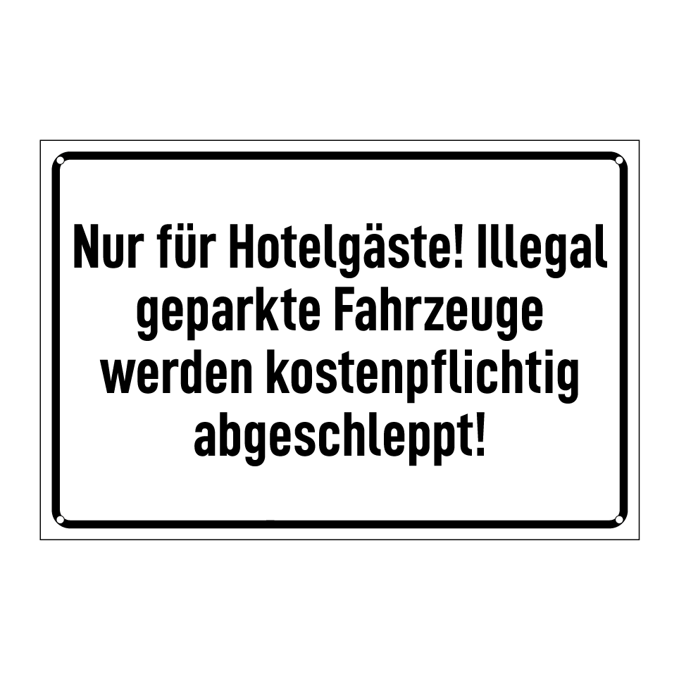 Parkschild mit dem Text Nur für Hotelgäste! Illegal geparkte Fahrzeuge werden kostenpflichtig abgeschleppt!