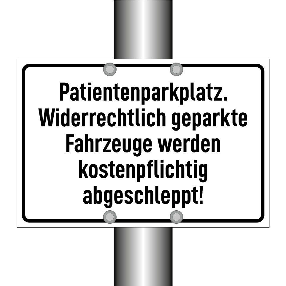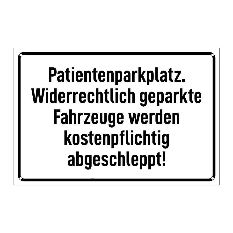 Parkschild mit dem Text Patientenparkplatz. Widerrechtlich geparkte Fahrzeuge werden kostenpflichtig abgeschleppt!