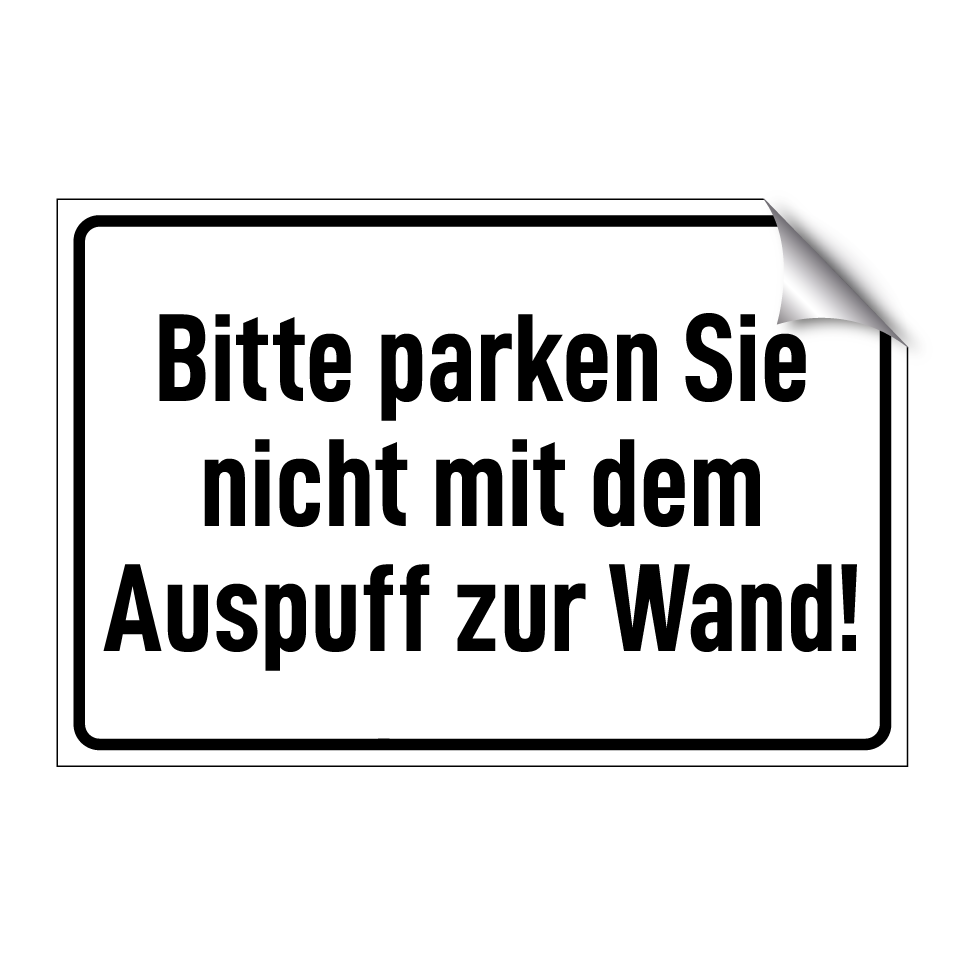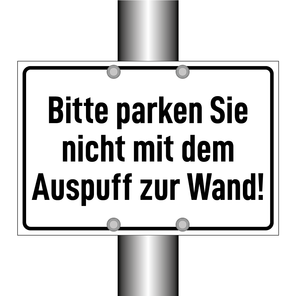 Parkverbotsschild mit dem Text Bitte parken Sie nicht mit dem Auspuff zur Wand!