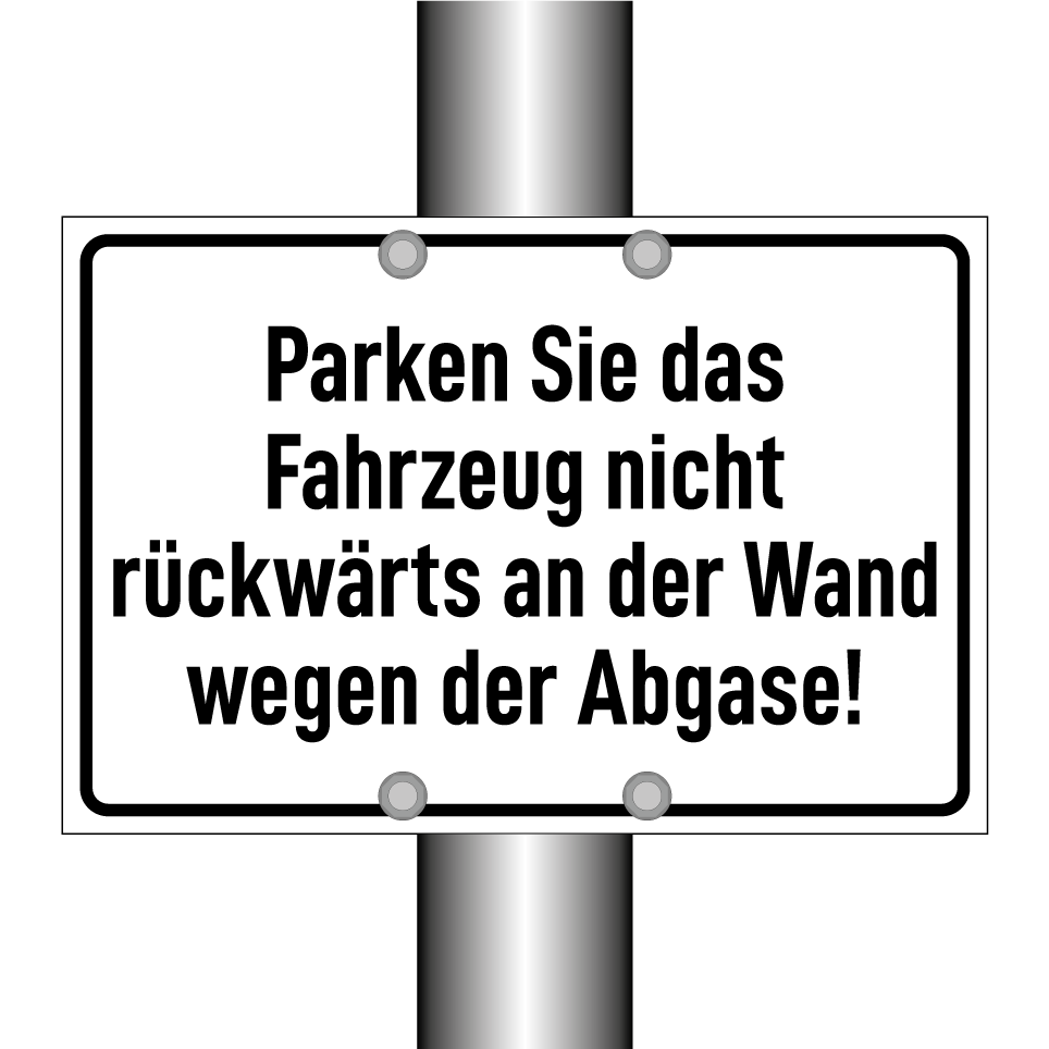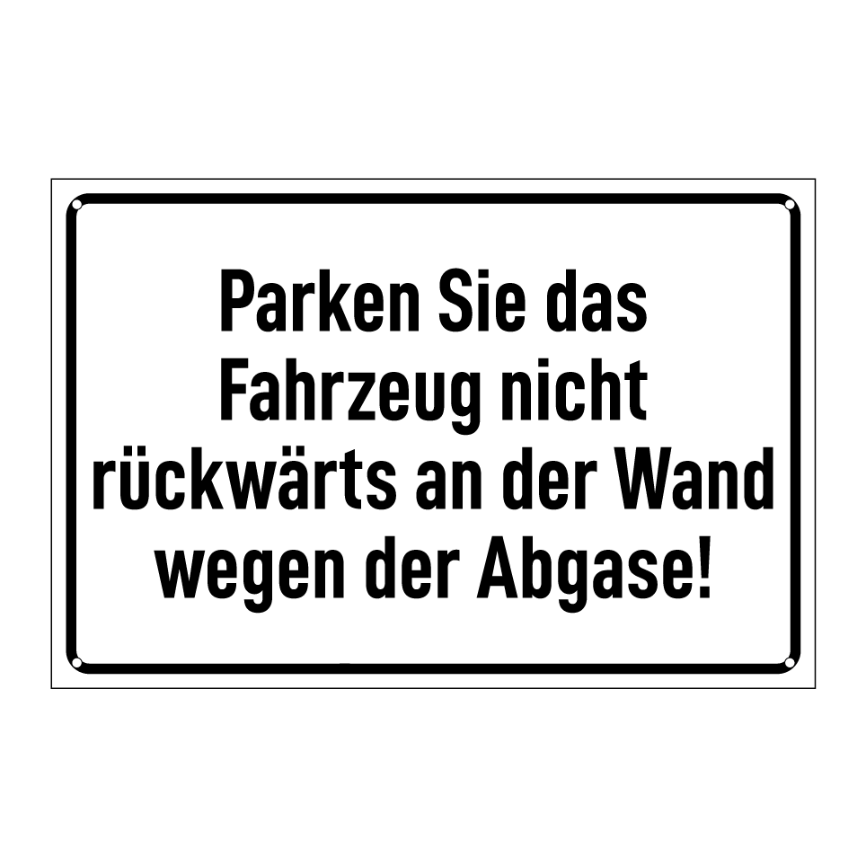 Parkverbotsschild mit dem Text Parken Sie das Fahrzeug nicht rückwärts an der Wand wegen der Abgase!