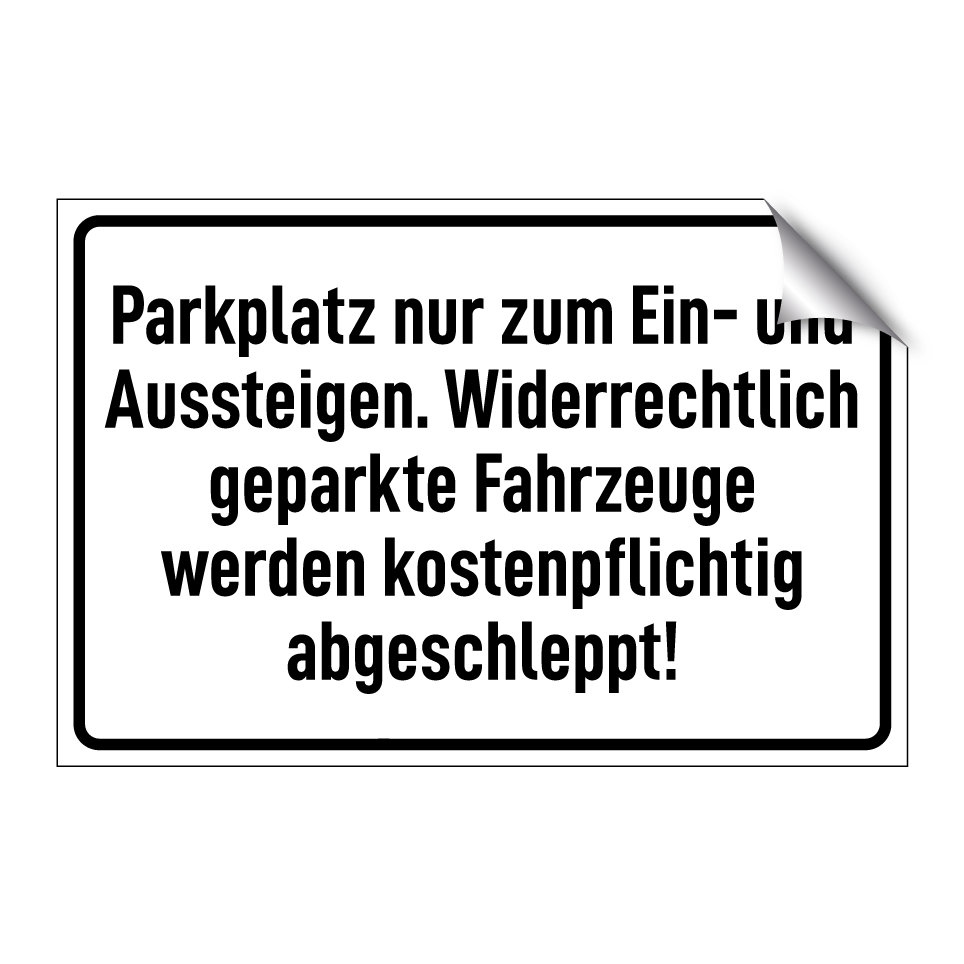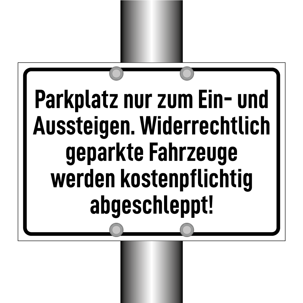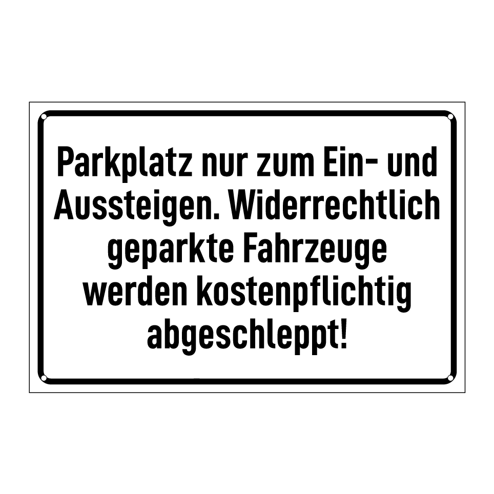 Parkschild mit dem Text Parkplatz nur zum Ein- und Aussteigen. Widerrechtlich geparkte Fahrzeuge werden kostenpflichtig abgeschleppt!