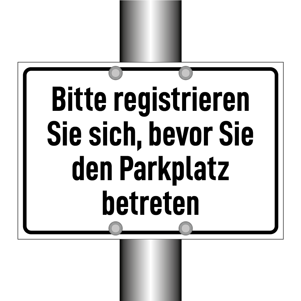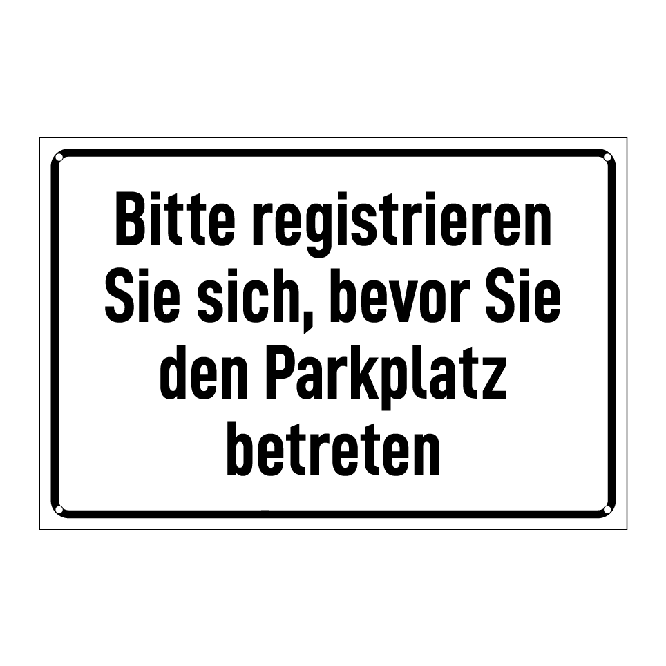 Parkschild mit dem Text Bitte registrieren Sie sich, bevor Sie den Parkplatz betreten
