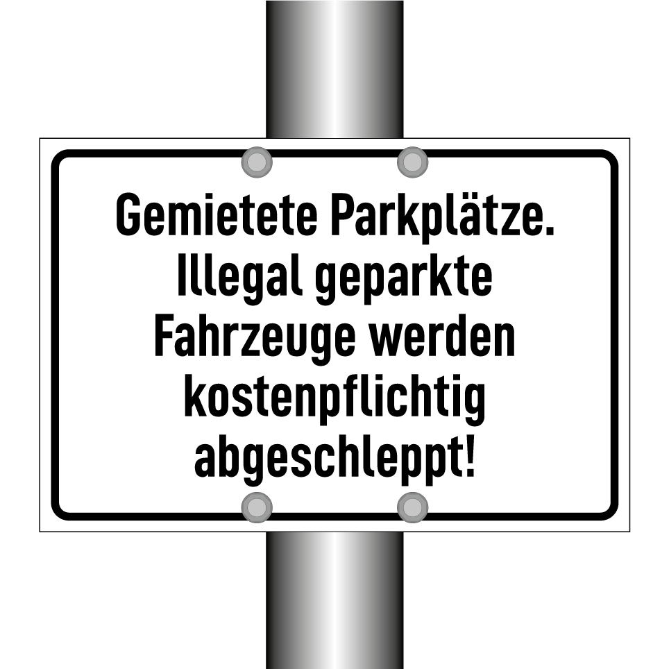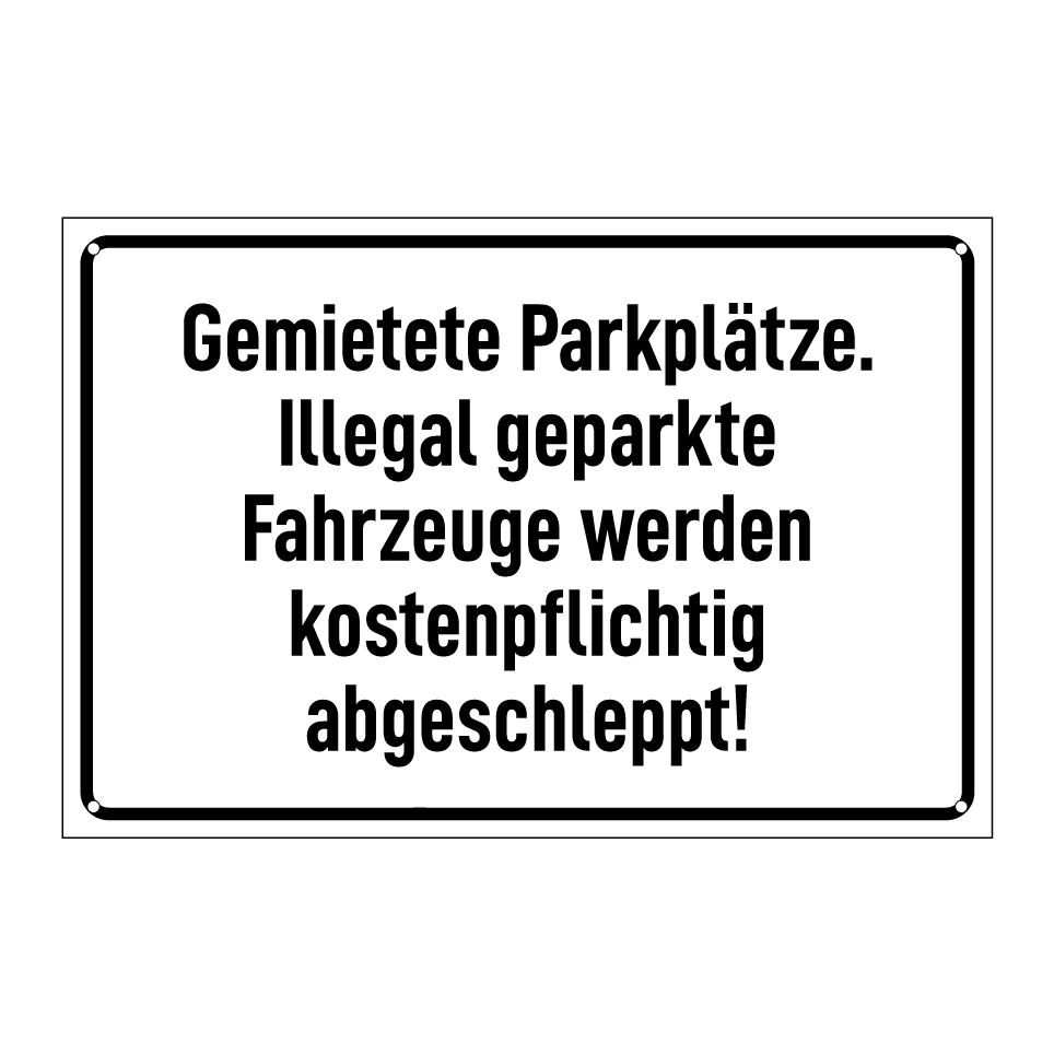 Parkschild mit dem Text Gemietete Parkplätze. Illegal geparkte Fahrzeuge werden kostenpflichtig abgeschleppt!