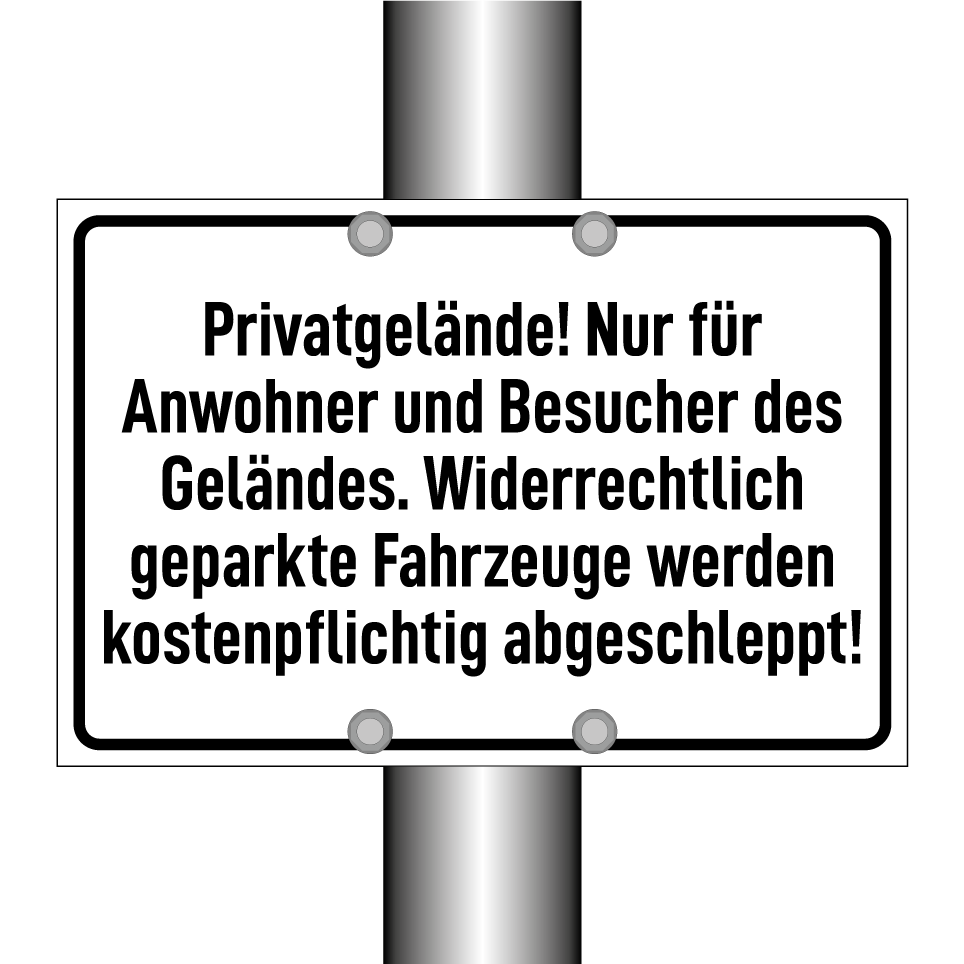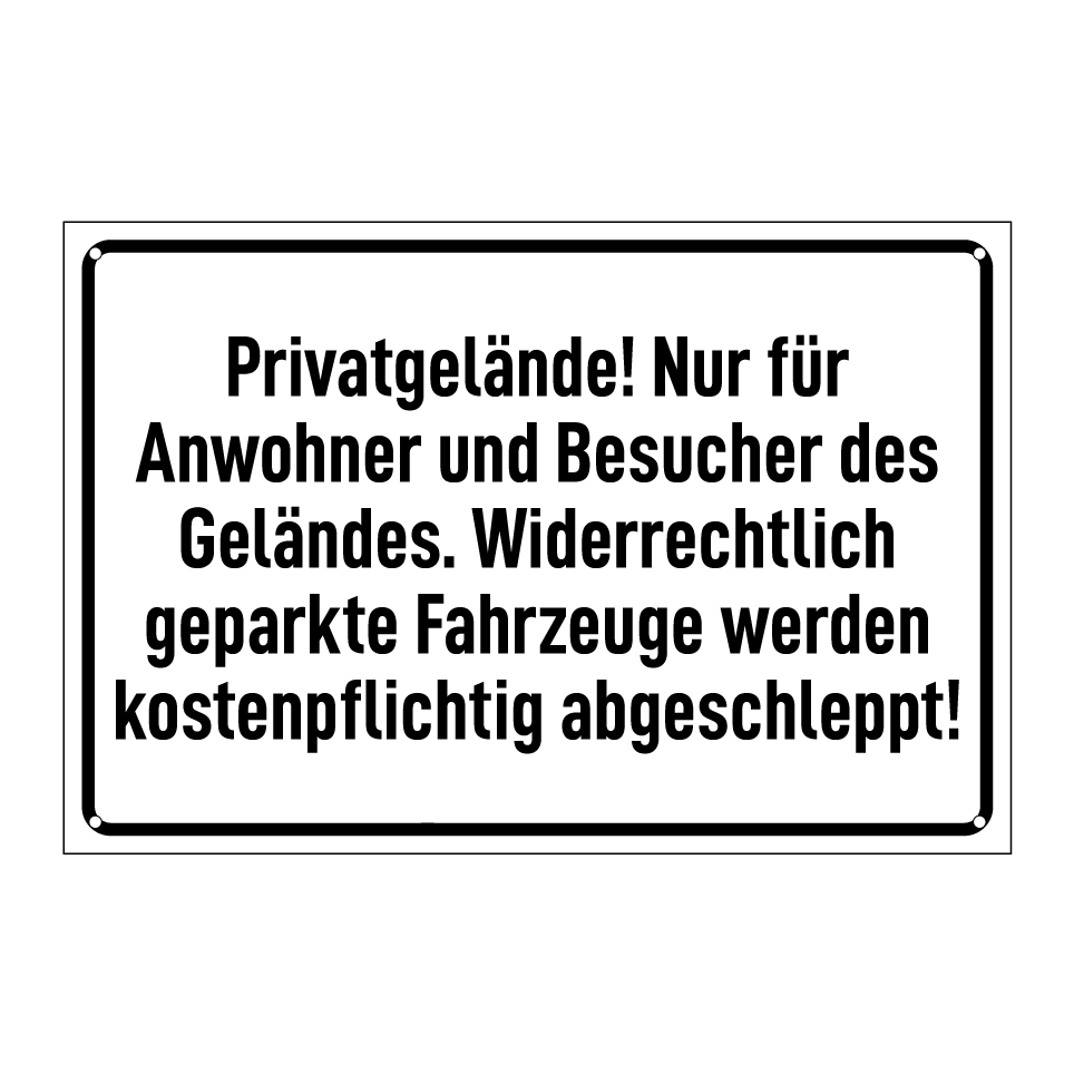 Parkschild mit dem Text Privatgelände! Nur für Anwohner und Besucher des Geländes. Widerrechtlich geparkte Fahrzeuge werden kostenpflichtig abgeschleppt!
