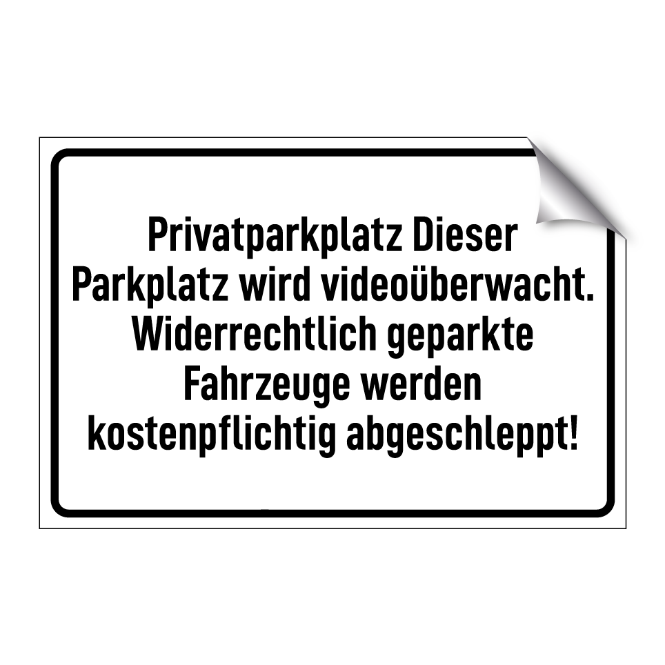 Parkschild mit dem Text Privatparkplatz Dieser Parkplatz wird videoüberwacht. Widerrechtlich geparkte Fahrzeuge werden kostenpflichtig abgeschleppt!