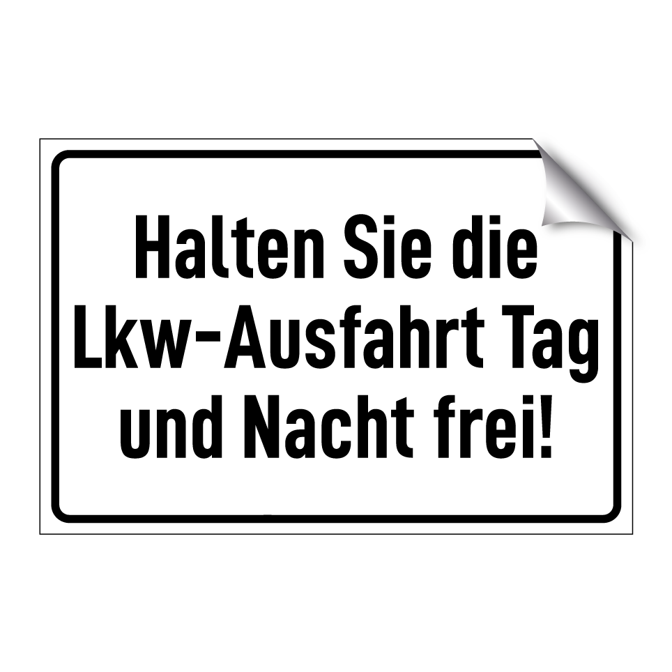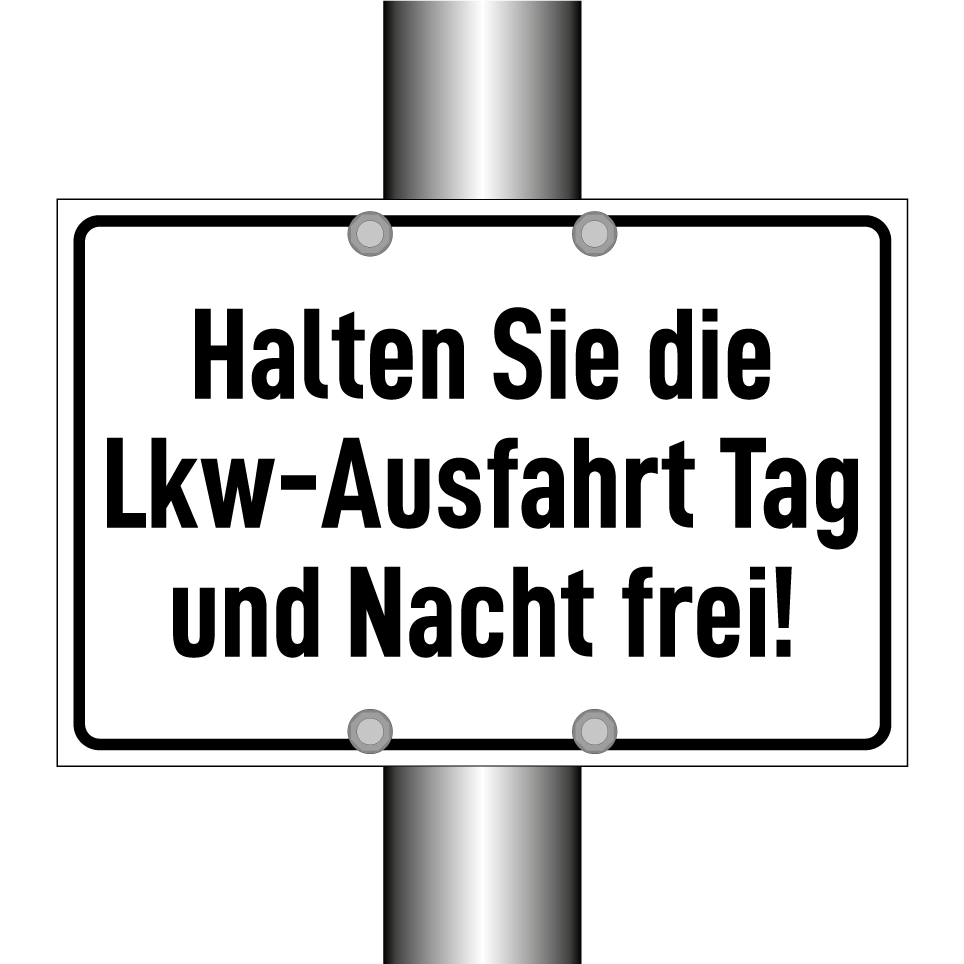 Parkverbotsschild mit dem Text Halten Sie die Lkw-Ausfahrt Tag und Nacht frei!