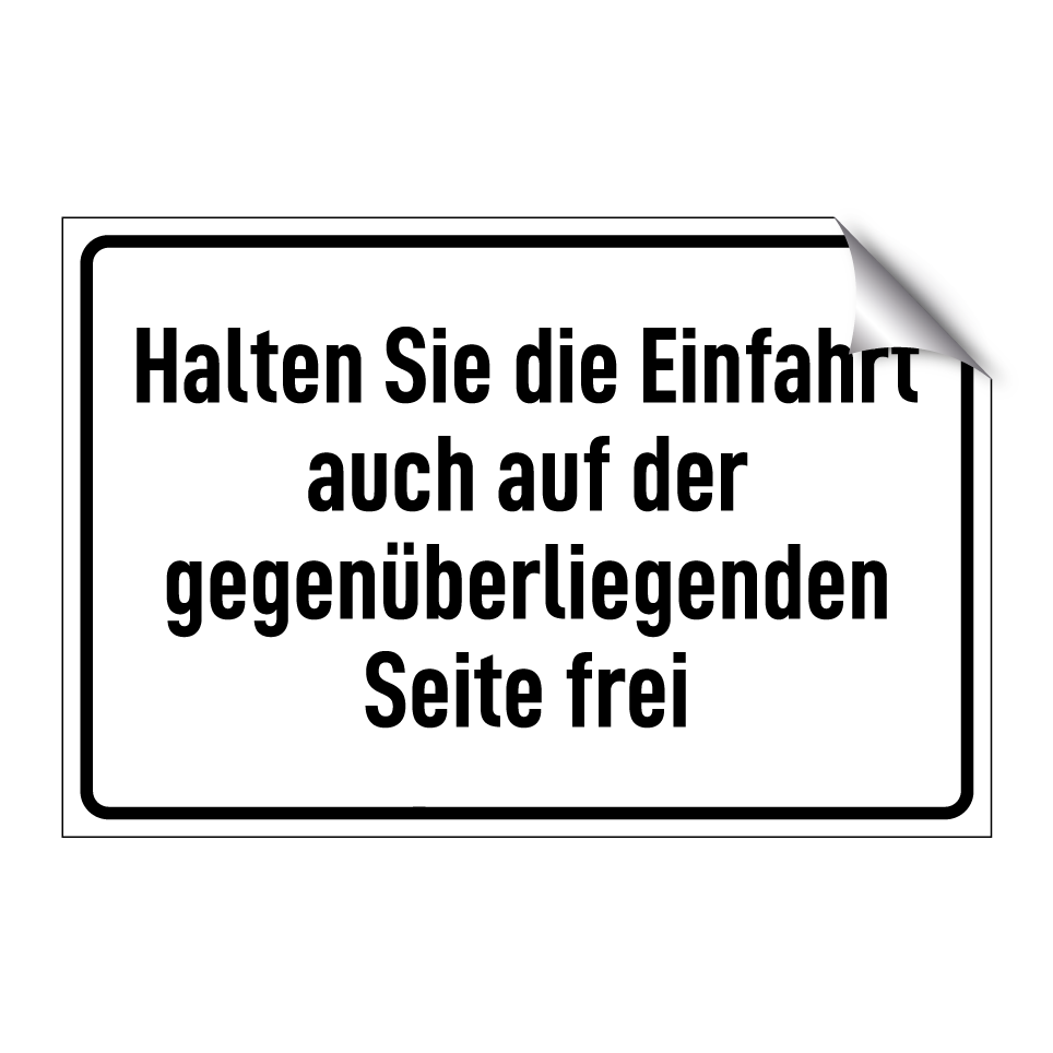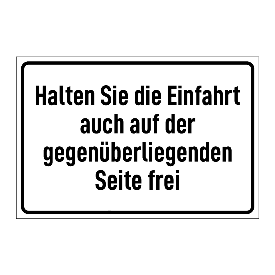 Parkverbotsschild mit dem Text Halten Sie die Einfahrt auch auf der gegenüberliegenden Seite frei
