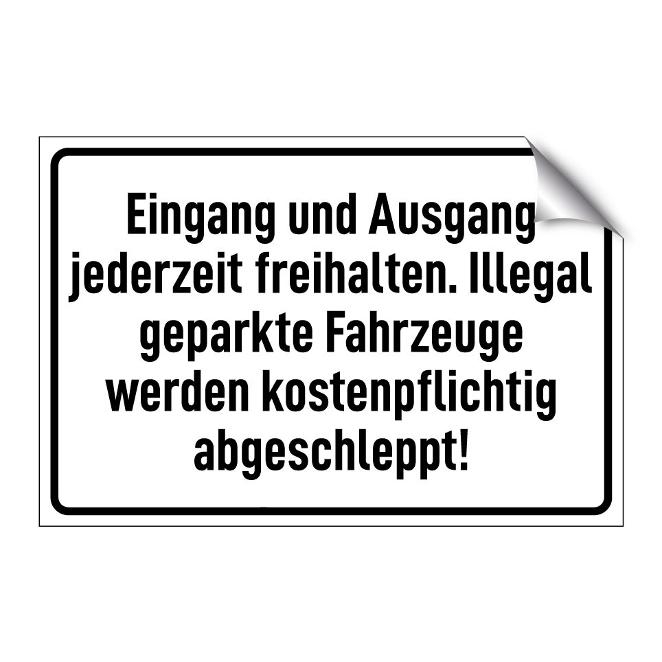Parkverbotsschild mit dem Text Eingang und Ausgang jederzeit freihalten. Illegal geparkte Fahrzeuge werden kostenpflichtig abgeschleppt!