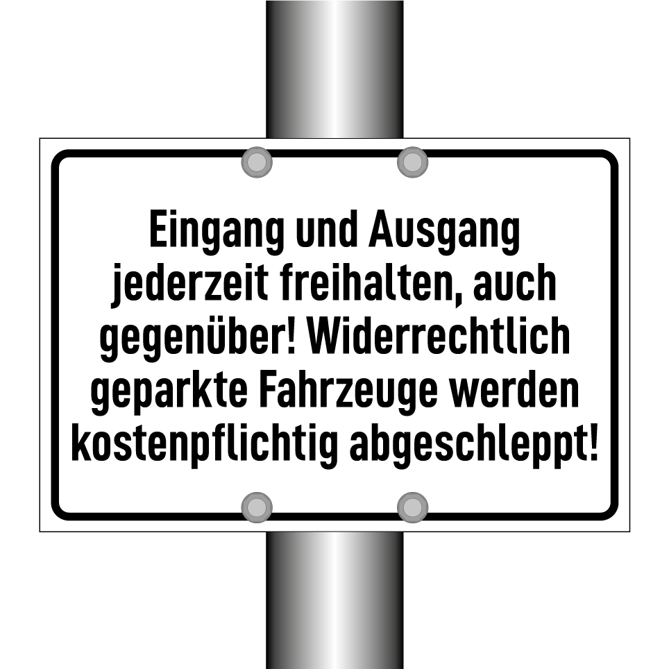 Parkverbotsschild mit dem Text Eingang und Ausgang jederzeit freihalten, auch gegenüber! Widerrechtlich geparkte Fahrzeuge werden kostenpflichtig abgeschleppt!