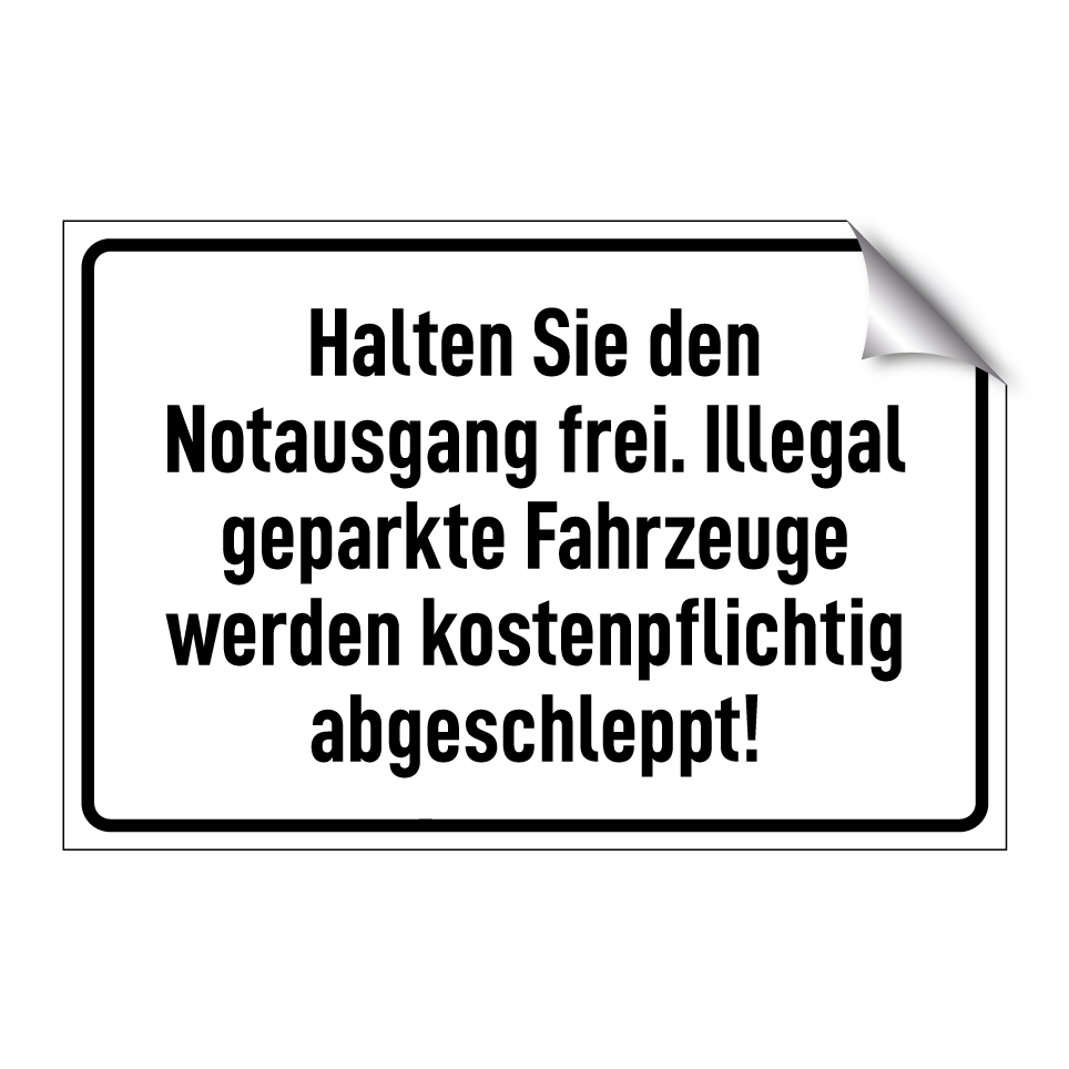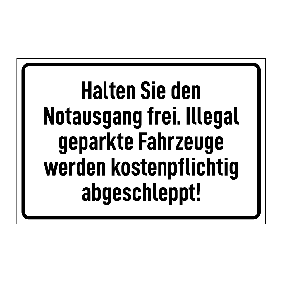 Parkverbotsschild mit dem Text Halten Sie den Notausgang frei. Illegal geparkte Fahrzeuge werden kostenpflichtig abgeschleppt!