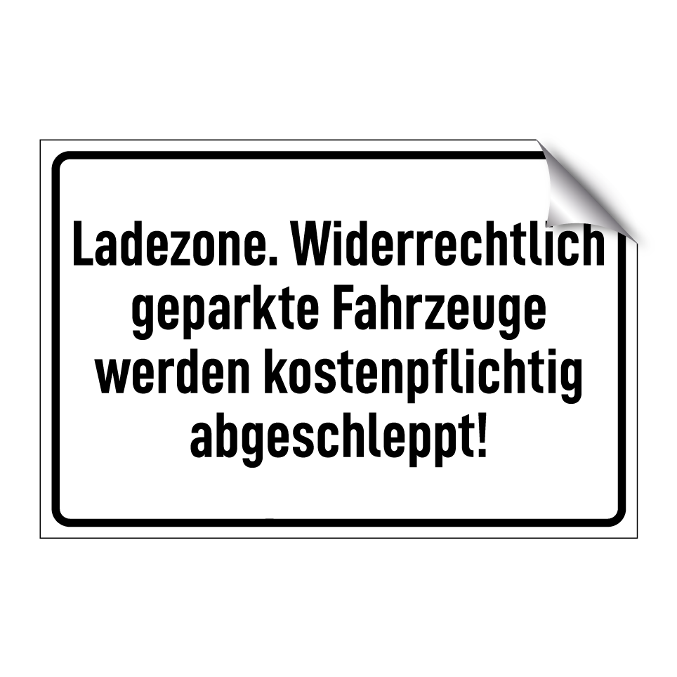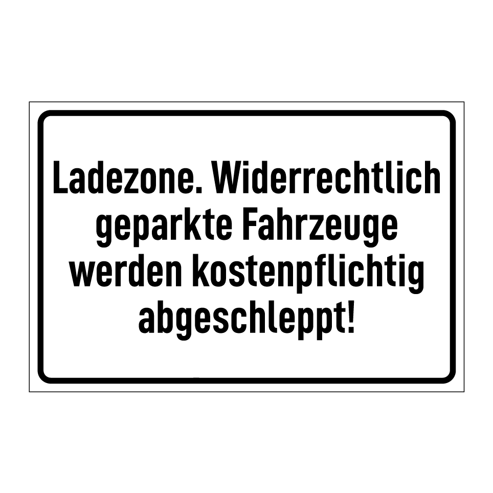 Parkverbotsschild mit dem Text Ladezone. Widerrechtlich geparkte Fahrzeuge werden kostenpflichtig abgeschleppt!