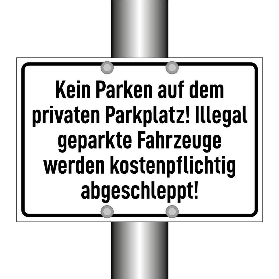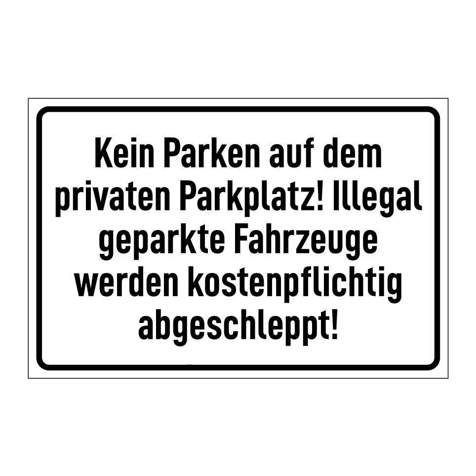 Parkverbotsschild mit dem Text Kein Parken auf dem privaten Parkplatz! Illegal geparkte Fahrzeuge werden kostenpflichtig abgeschleppt!