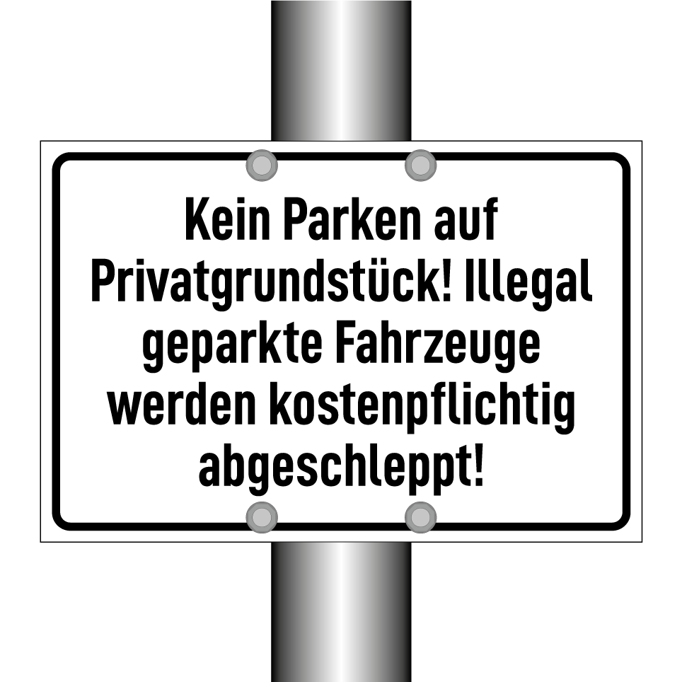 Parkverbotsschild mit dem Text Kein Parken auf Privatgrundstück! Illegal geparkte Fahrzeuge werden kostenpflichtig abgeschleppt!