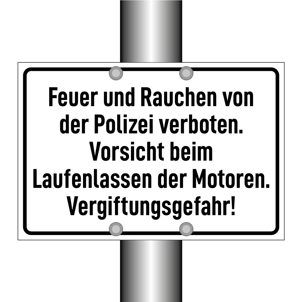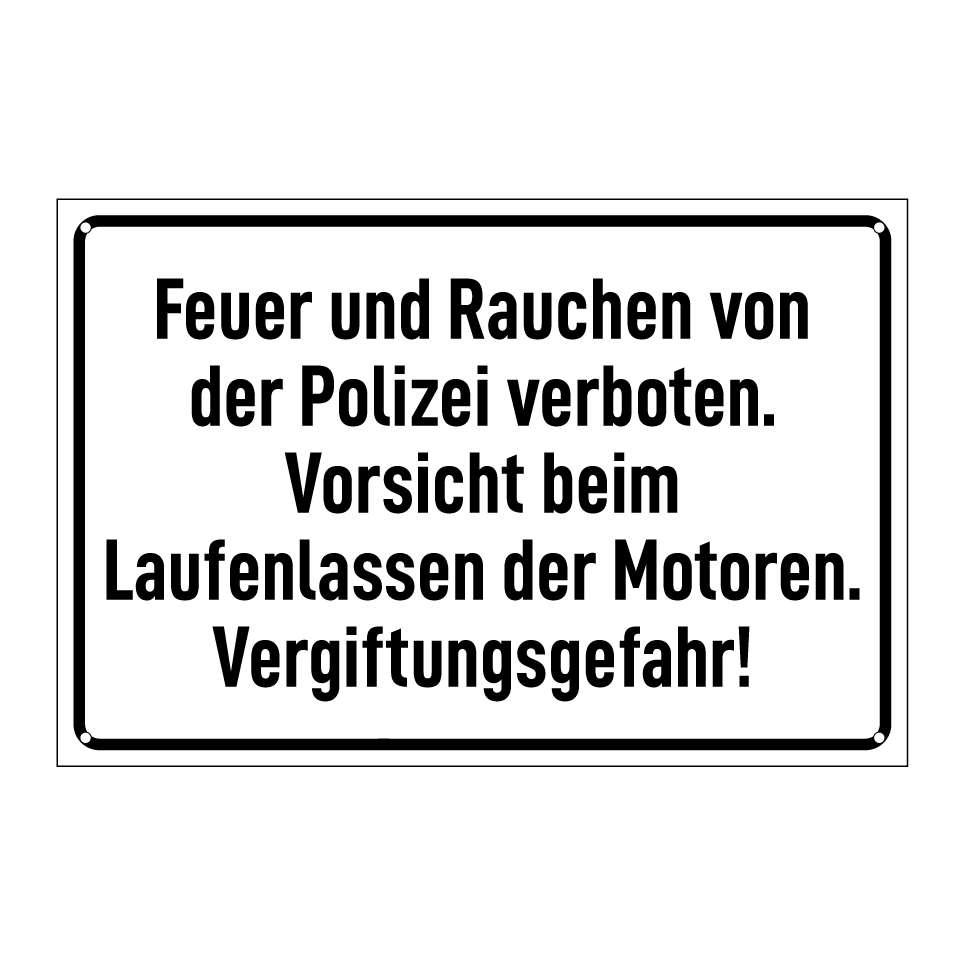 Parkschild mit dem Text Feuer und Rauchen von der Polizei verboten. Vorsicht beim Laufenlassen der Motoren. Vergiftungsgefahr!