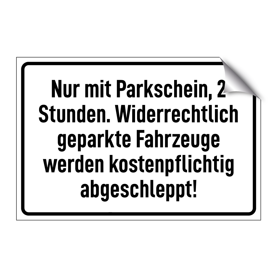 Parkschild mit dem Text Nur mit Parkschein, 2 Stunden. Widerrechtlich geparkte Fahrzeuge werden kostenpflichtig abgeschleppt!