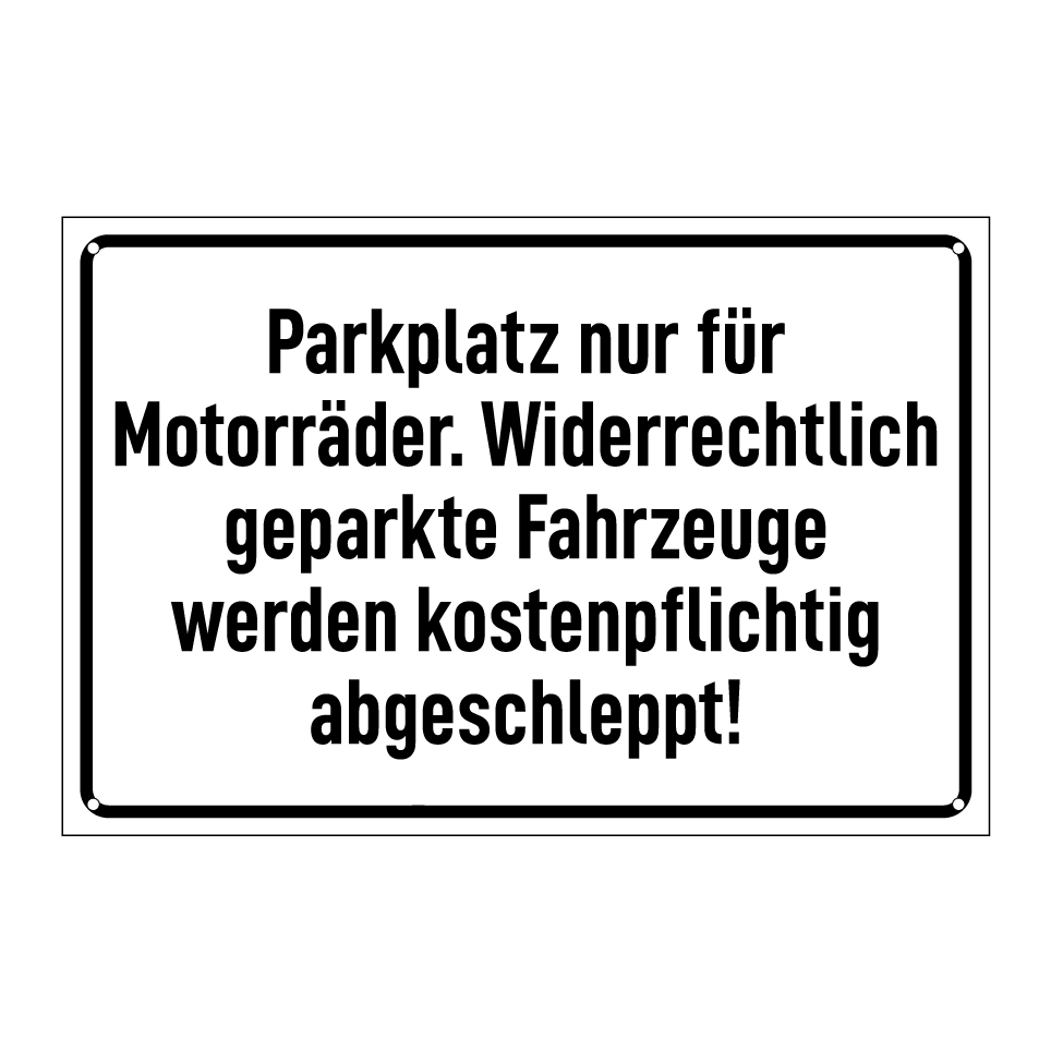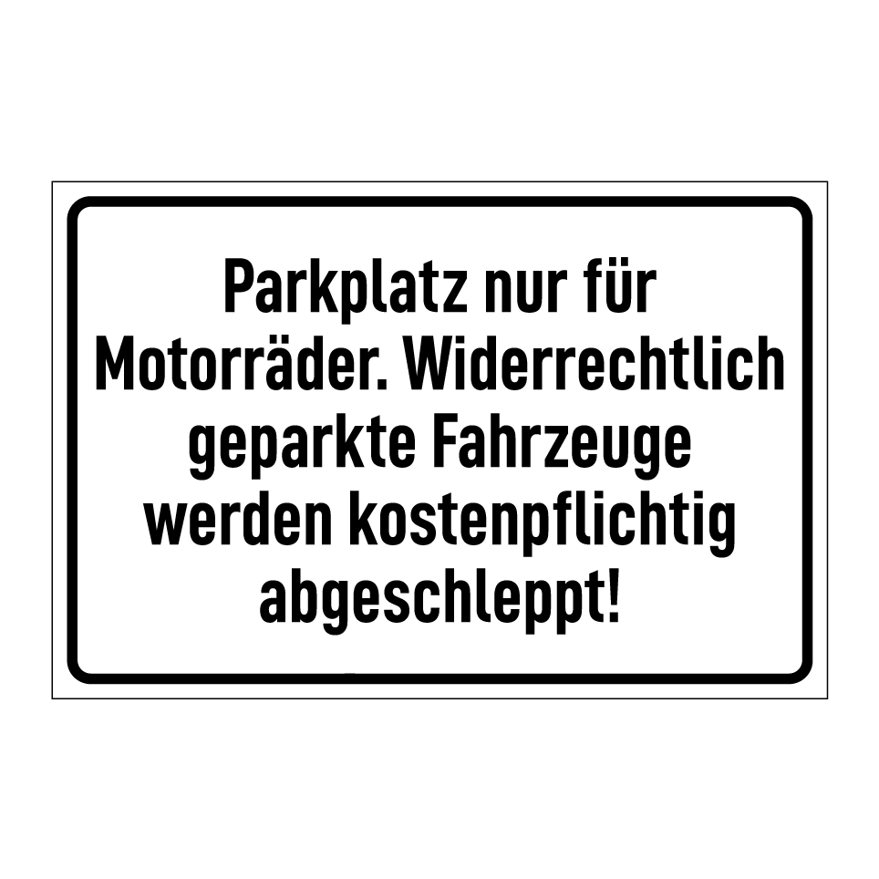 Diese Parkplatzbeschilderung ist ideal für Bereiche, die ausschließlich für Motorräder reserviert sind. Sie eignet sich perfekt für Parkplätze in städtischen Gebieten, Einkaufszentren oder Bürokomplexen, um sicherzustellen, dass nur Motorräder parken. Die klare Botschaft verhindert unbefugtes Parken und warnt davor, dass widerrechtlich abgestellte Fahrzeuge kostenpflichtig abgeschleppt werden. Platzieren Sie das Schild gut sichtbar an Einfahrten oder in der Nähe von Parkflächen, um die Einhaltung der Parkregeln zu gewährleisten und Missverständnisse zu vermeiden.