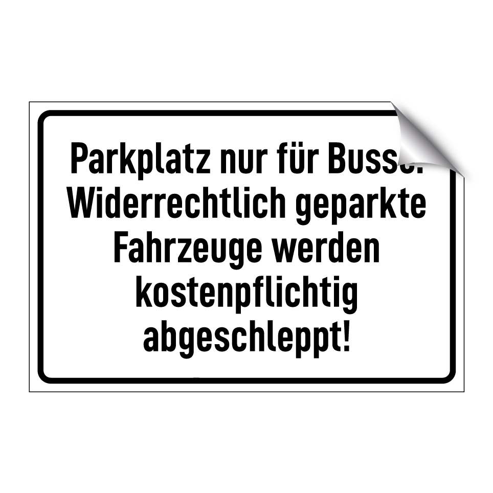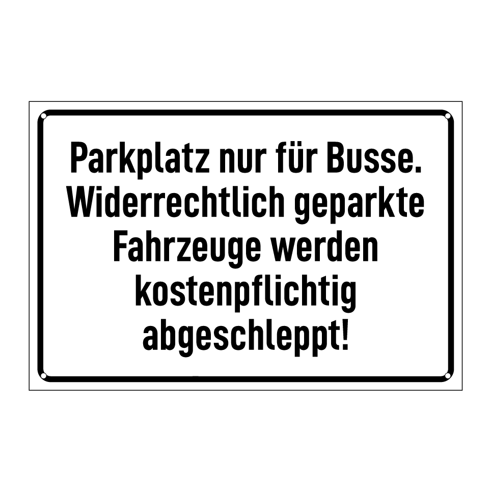 Parkschild mit dem Text Parkplatz nur für Busse. Widerrechtlich geparkte Fahrzeuge werden kostenpflichtig abgeschleppt!