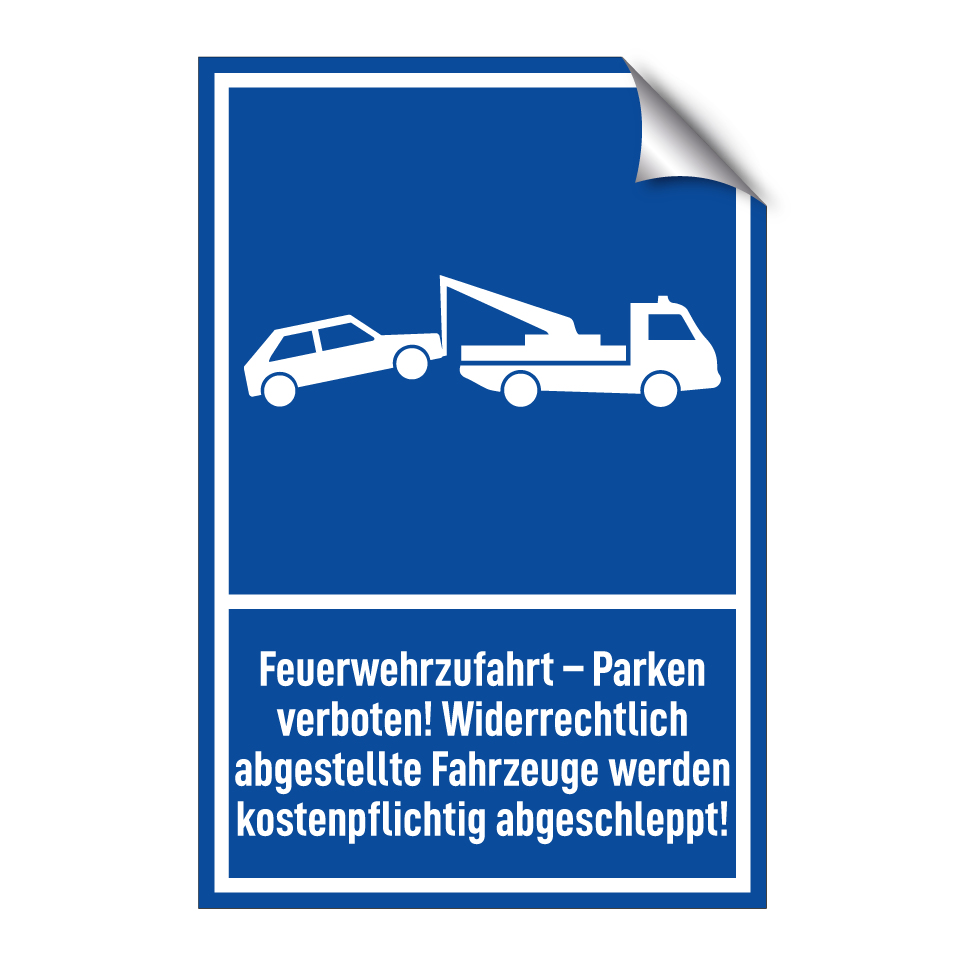 Parkschild mit dem Text Feuerwehrzufahrt – Parken verboten! Widerrechtlich abgestellte Fahrzeuge werden kostenpflichtig abgeschleppt!