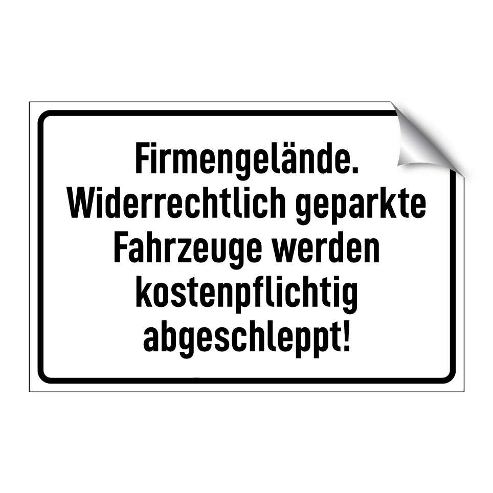 Parkverbotsschild mit dem Text Firmengelände. Widerrechtlich geparkte Fahrzeuge werden kostenpflichtig abgeschleppt!