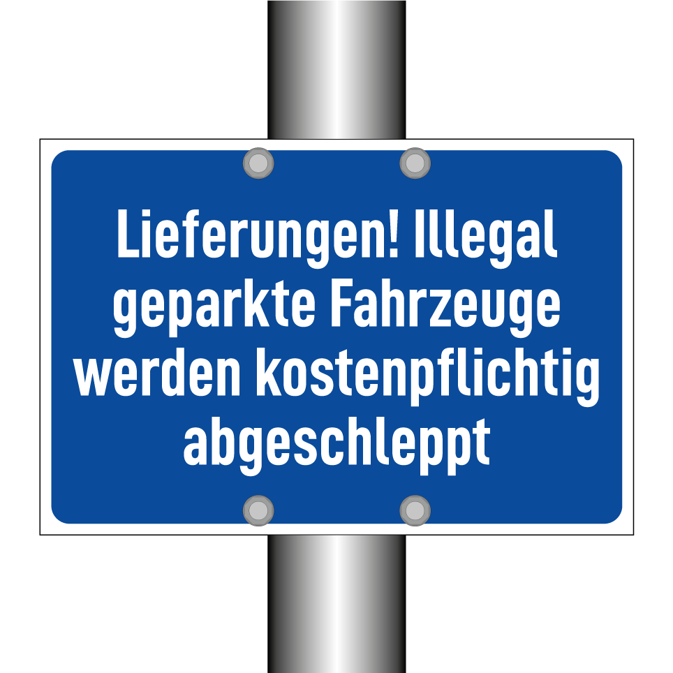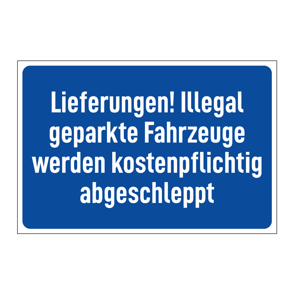 Parkschild mit dem Text Lieferungen! Illegal geparkte Fahrzeuge werden kostenpflichtig abgeschleppt