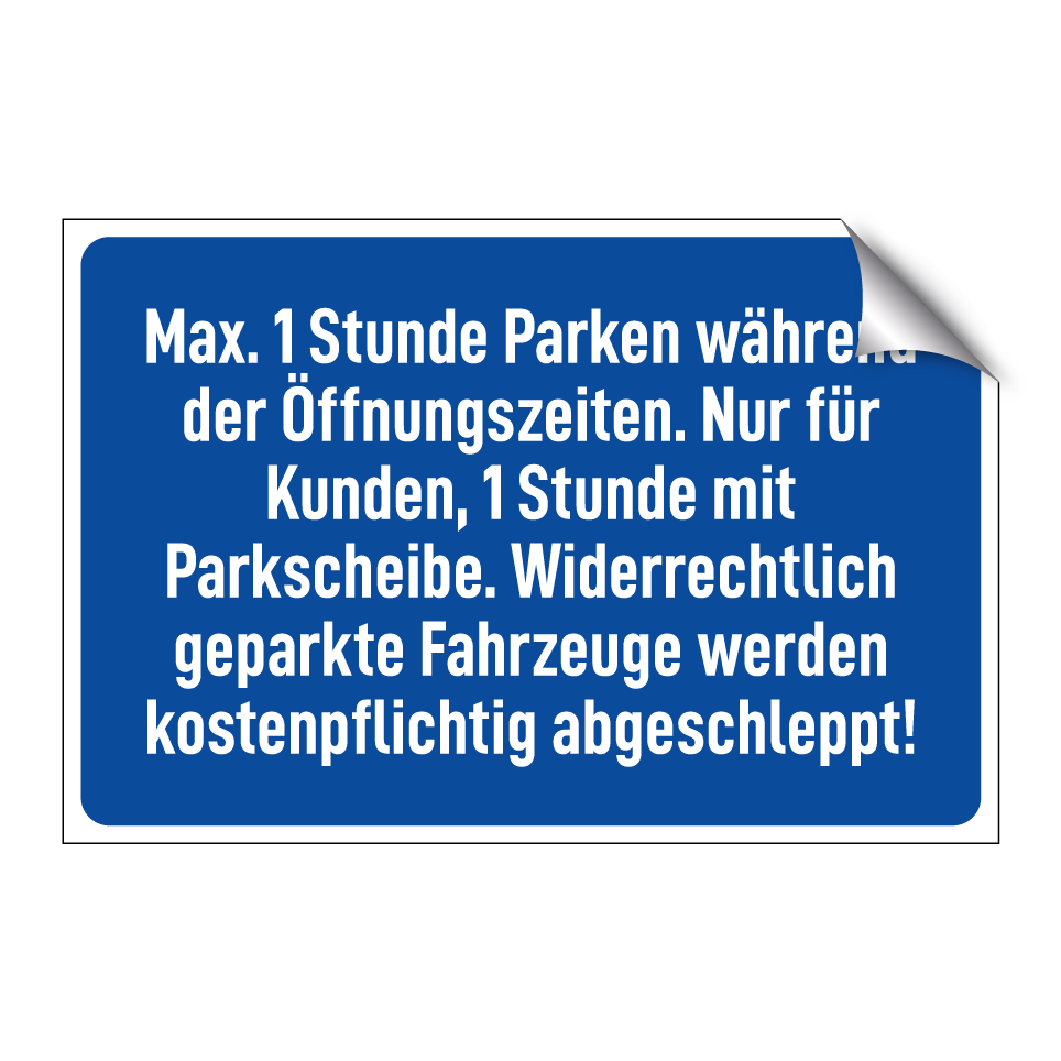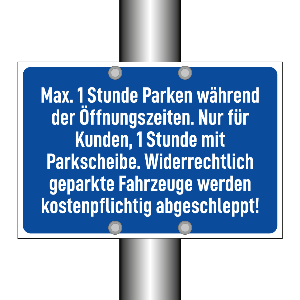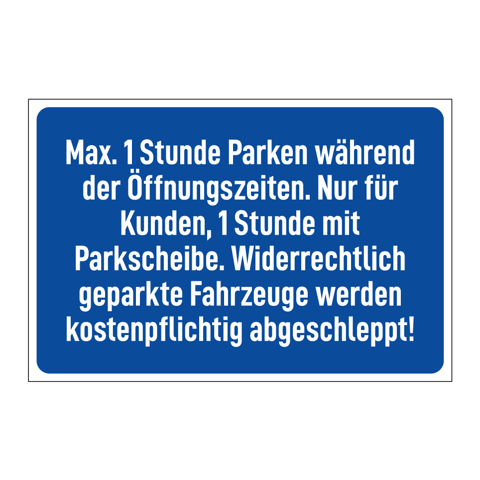 Parkschild mit dem Text Max. 1 Stunde Parken während der Öffnungszeiten. Nur für Kunden, 1 Stunde mit Parkscheibe. Widerrechtlich geparkte Fahrzeuge werden kostenpflichtig abgeschleppt!