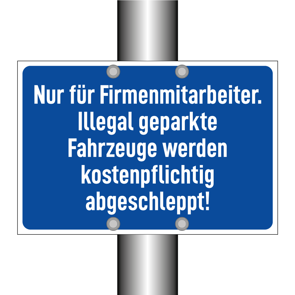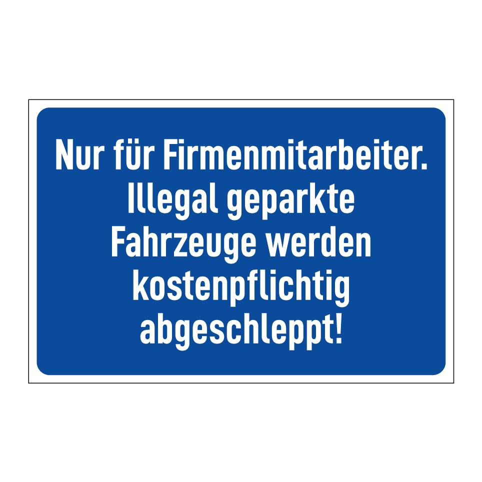 Parkschild mit dem Text Nur für Firmenmitarbeiter. Illegal geparkte Fahrzeuge werden kostenpflichtig abgeschleppt!