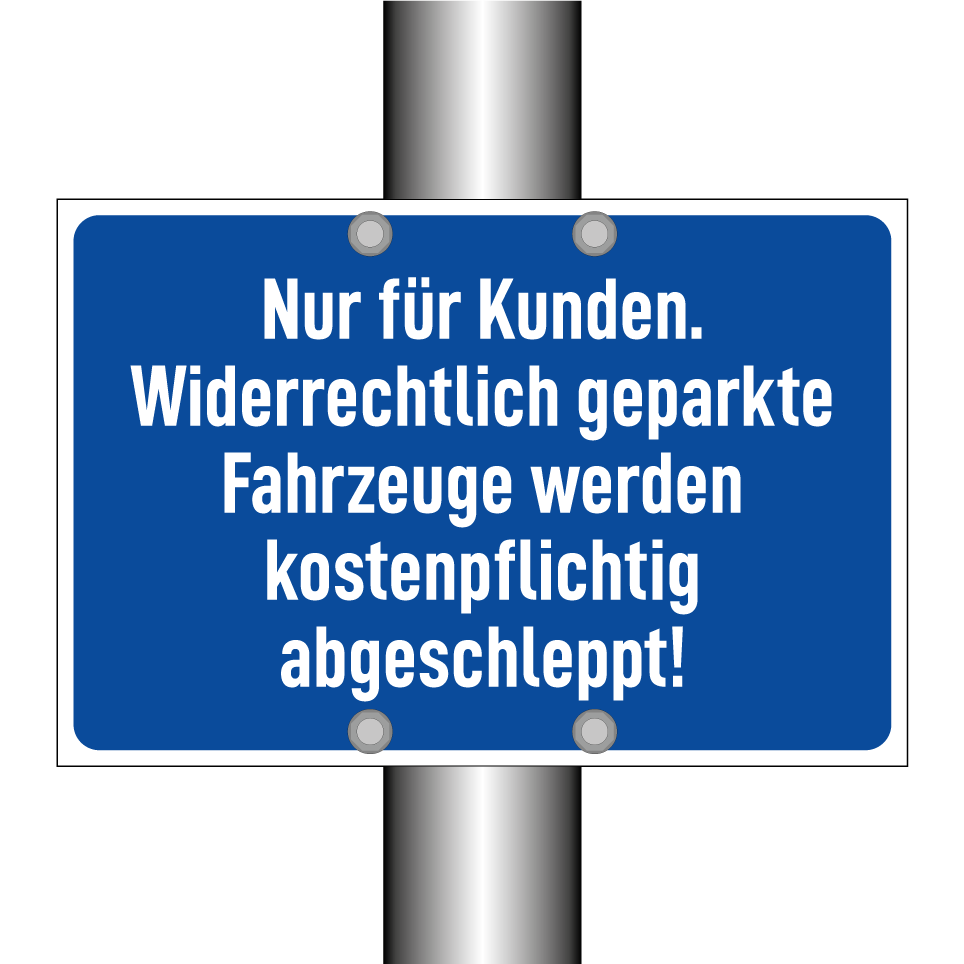 Parkschild mit dem Text Nur für Kunden. Widerrechtlich geparkte Fahrzeuge werden kostenpflichtig abgeschleppt!