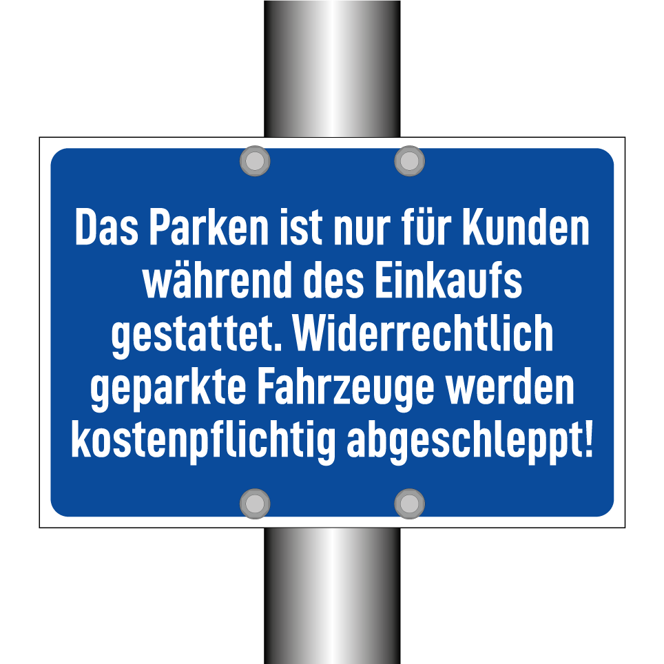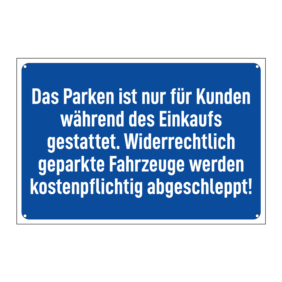 Parkschild mit dem Text Das Parken ist nur für Kunden während des Einkaufs gestattet. Widerrechtlich geparkte Fahrzeuge werden kostenpflichtig abgeschleppt!