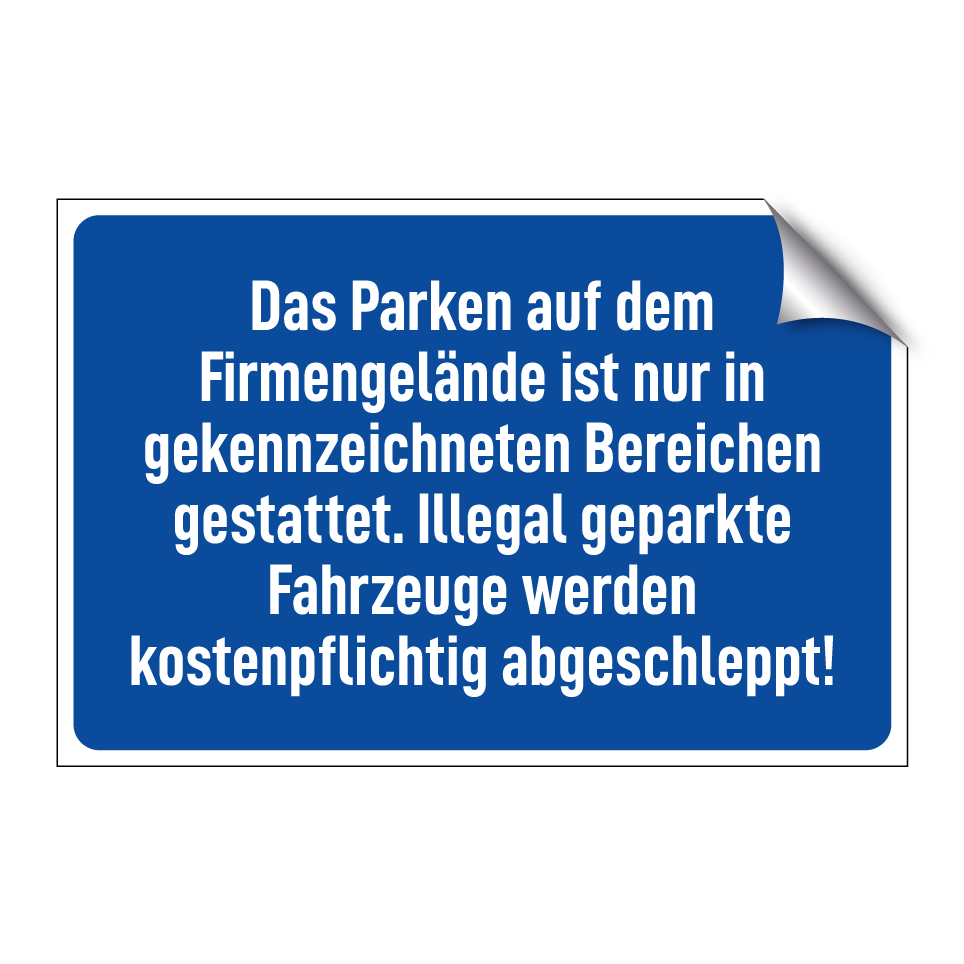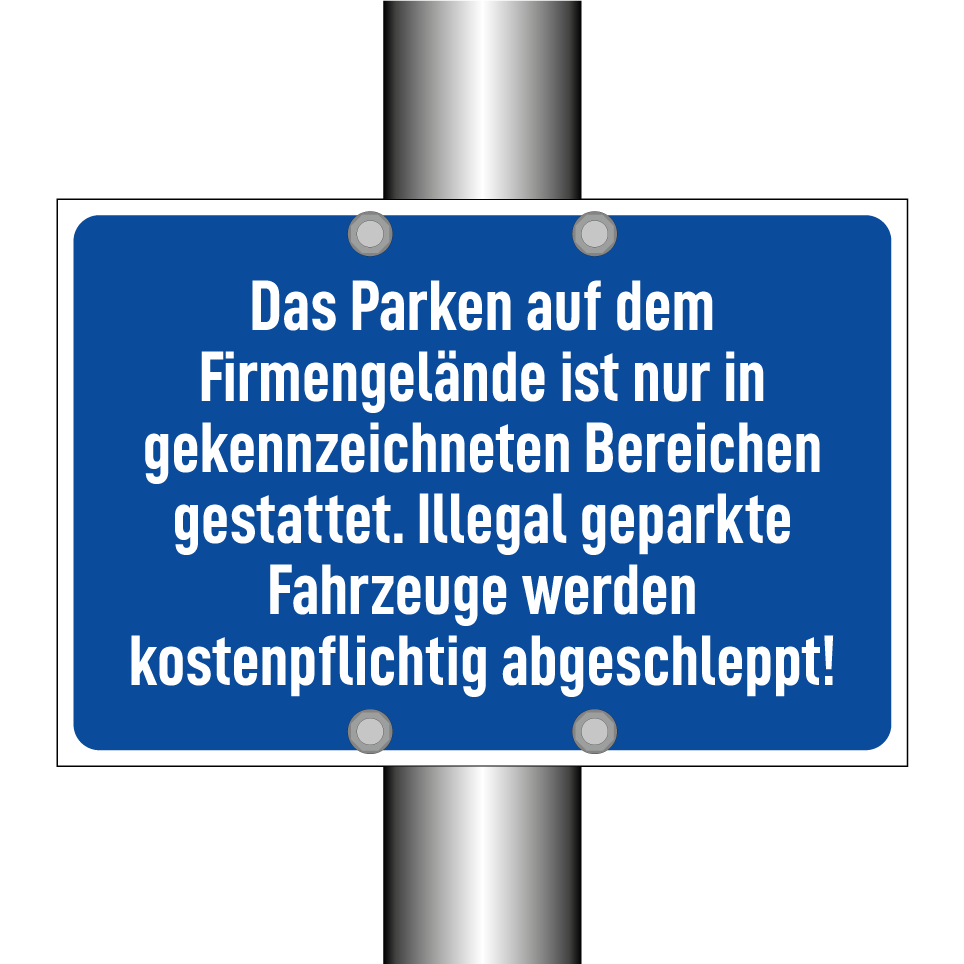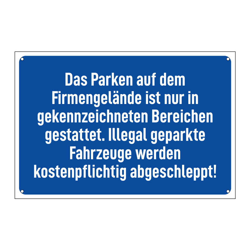 Parkschild mit dem Text Das Parken auf dem Firmengelände ist nur in gekennzeichneten Bereichen gestattet. Illegal geparkte Fahrzeuge werden kostenpflichtig abgeschleppt!