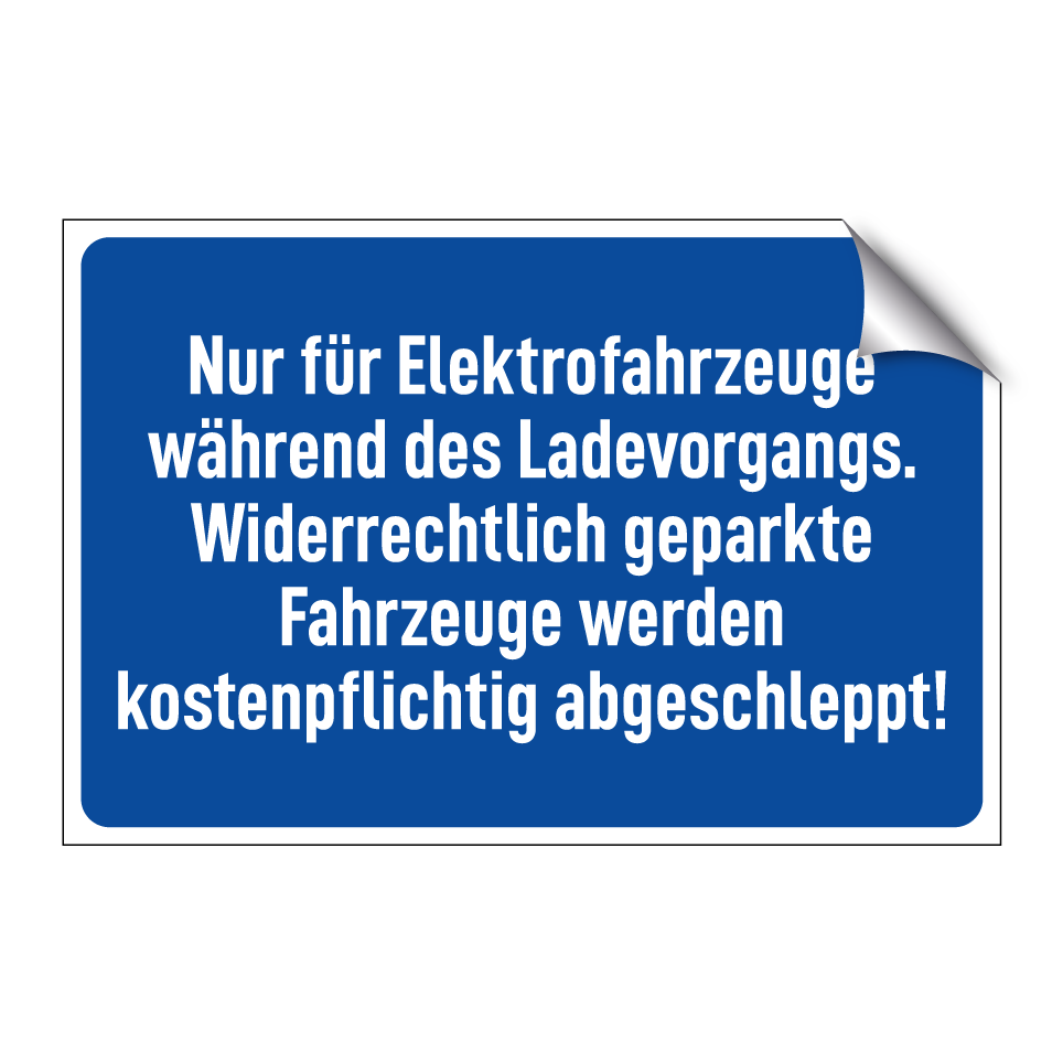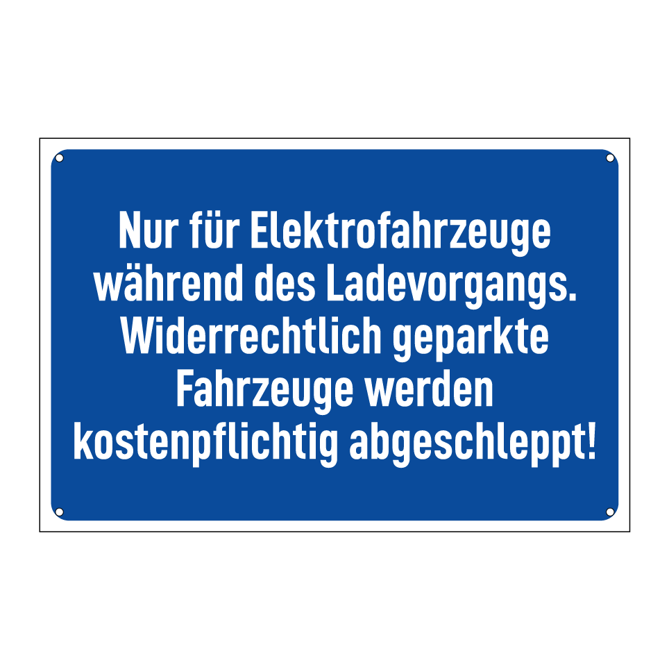 Parkschild mit dem Text Nur für Elektrofahrzeuge während des Ladevorgangs. Widerrechtlich geparkte Fahrzeuge werden kostenpflichtig abgeschleppt!