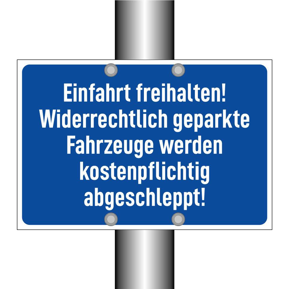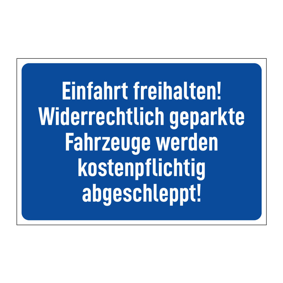 Parkverbotsschild mit dem Text Einfahrt freihalten! Widerrechtlich geparkte Fahrzeuge werden kostenpflichtig abgeschleppt!