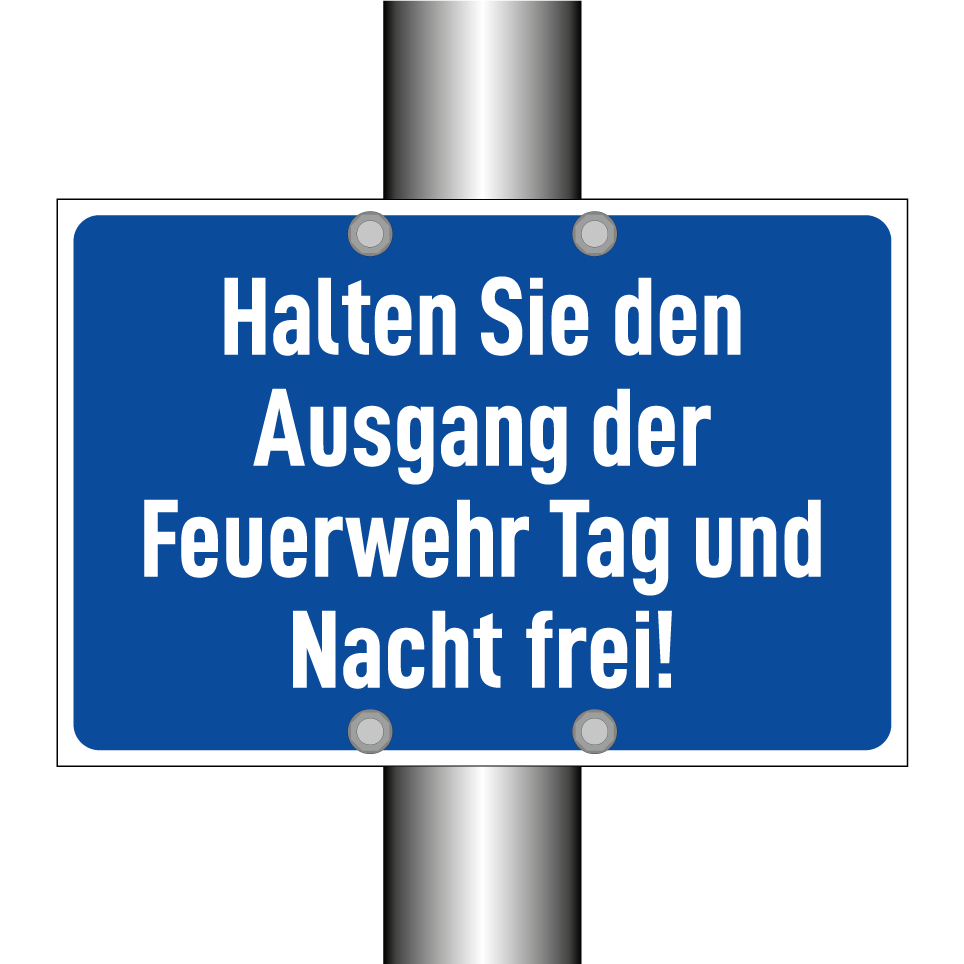 Parkverbotsschild mit dem Text Halten Sie den Ausgang der Feuerwehr Tag und Nacht frei!