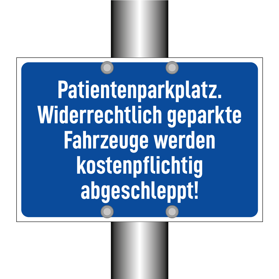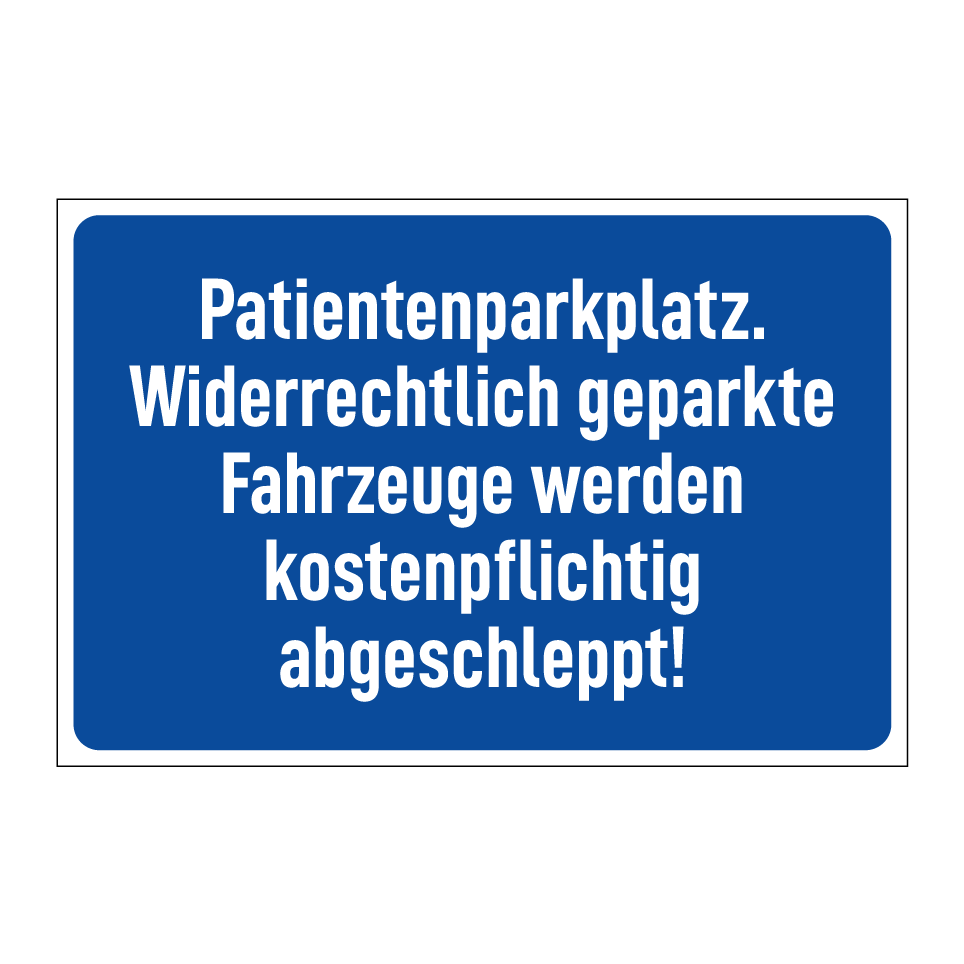 Parkschild mit dem Text Patientenparkplatz. Widerrechtlich geparkte Fahrzeuge werden kostenpflichtig abgeschleppt!