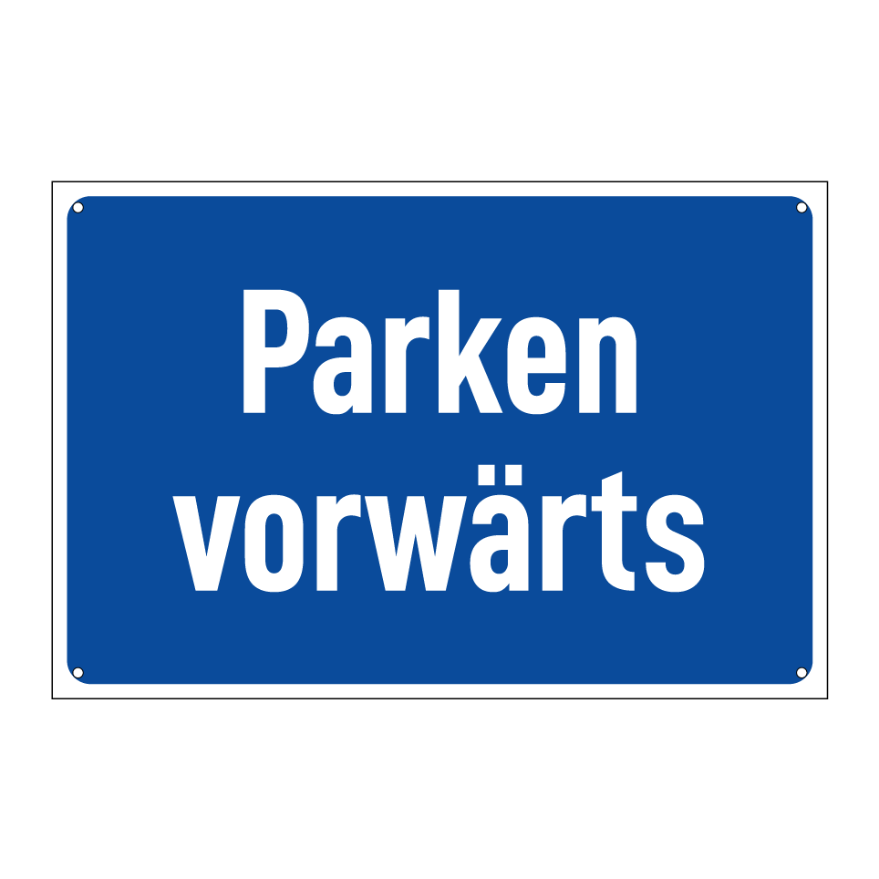 Diese Hinweistafel eignet sich ideal für Parkplätze, um den Verkehr zu lenken und das ordnungsgemäße Parken zu gewährleisten. Sie kann an Einfahrten, in Parkhäusern oder auf privaten Grundstücken angebracht werden, um Autofahrern klare Anweisungen zu geben. Die auffällige blaue Farbe mit weißem Rahmen und Text sorgt für hohe Sichtbarkeit und klare Kommunikation. Diese Beschilderung ist besonders nützlich in Bereichen, in denen das Vorwärtsparken bevorzugt oder erforderlich ist, um den Verkehrsfluss zu optimieren.