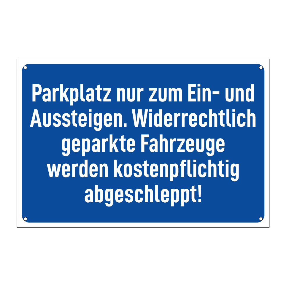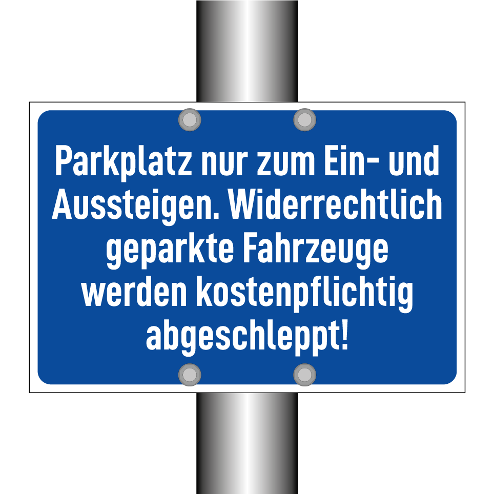 Parkschild mit dem Text Parkplatz nur zum Ein- und Aussteigen. Widerrechtlich geparkte Fahrzeuge werden kostenpflichtig abgeschleppt!