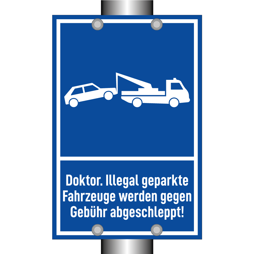 Parkschild mit dem Text Doktor. Illegal geparkte Fahrzeuge werden gegen Gebühr abgeschleppt!