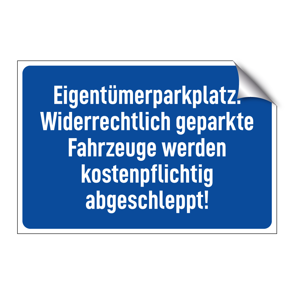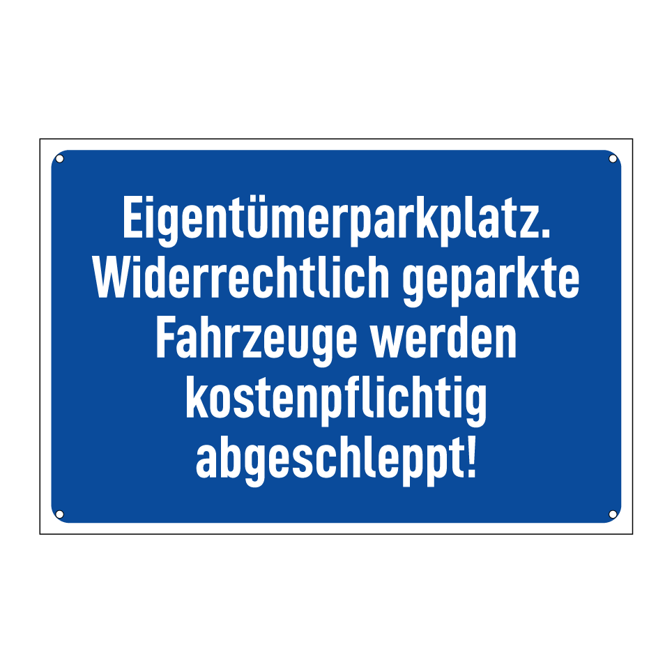 Parkschild mit dem Text Eigentümerparkplatz. Widerrechtlich geparkte Fahrzeuge werden kostenpflichtig abgeschleppt!